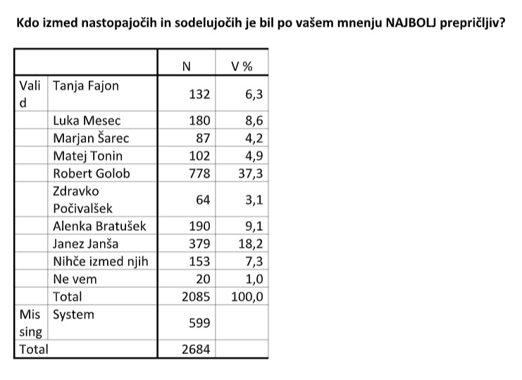 Agencija Ninamedia, ki meri javno mnenje, je izmerila prepričljivost politikov tudi na četrtem soočenju predstavnikov strank na POP TV. Gledalci in gledalke so kot najbolj prepričljivega ponovno ocenili Roberta Goloba (Gibanje Svoboda), namenili so mu 37,3 odstotka podpore. Blizu mu ni prišel niti predsednik največje vladne stranke Janez Janša, ki se je tokrat končno udeležil televizijskih soočenj na največji komercialni televiziji. Gledalke in gledalci, ki spremljajo televizijska soočenja, so obenem najbolj dejavni volivci in volivke, Janša pa je prepričal zgolj 18,2 odstotka gledalk in gledalcev.