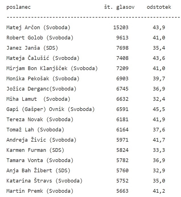 Na nedeljskih parlamentarnih volitvah so bili nekateri kandidati v Državni zbor (DZ) izvoljeni z več tisoč glasovi, drugi pa le z nekaj sto. Med izvoljenimi poslanci je največ glasov, dobrih 15.000, prejel nekdanji novogoriški župan Matej Arčon (Gibanje Svoboda), najmanj pa aktualna poslanka SD Bojana Muršič. Nekatere pa je volilna aritmetika stala uvrstitve v DZ.