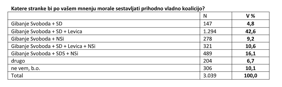 Spletna anketa javnomnenjske agencije Ninamedia, ki je bila opravljena po državnozborskih volitvah, 25. in 26. aprila (sodelovalo je 3.039 vprašanih), razkriva, da ima med volivci in volivkami v Sloveniji največ podpore vladna koalicija strank Gibanje Svoboda, SD in Levica. Za slednjo je glasovala slaba polovica vprašanih (42,6 odstotka), daleč na drugem mestu z zgolj 16 odstotki je koalicija Gibanje Svoboda + SDS + NSi, za katero pa je že najverjetnejši novi mandatar Robert Golob povedal, da ni mogoče, saj z Janševo SDS in Toninovo NSi ne želi sodelovati.