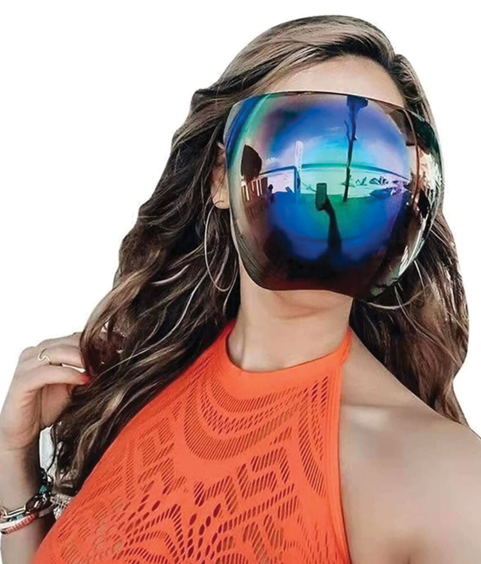 Sončna očala s polariziranimi stekli so lahko za ljudi okoli nosilca očal neprijetna, saj tisti, ki jih nosi, dobro vidi sogovornike, slednji pa ne morejo videti njegovih oči; namesto tega zrejo le v svoj odsev v zrcalnih steklih. Nevšečnost je zdaj do skrajnosti potencirana pri polariziranih sončnih očalih, ki segajo čez ves obraz. Nastala so, kakopak, med pandemijo, pred približno letom dni, in na prvi pogled spominjajo na vizir, s katerim so svoj obraz pred virusom ščitili predvsem zdravstveni delavci. Vizirska zrcalna sončna očala so na voljo v različnih izvedbah: modrikasti, zelenkasti, rdečkasti, oranžkasti, srebrnkasti ... Naslon za nos je mogoče odstraniti, tako da lahko pod sončnim vizirjem nosimo celo očala z dioptrijo. Ker gre za sončna očala, seveda odbijajo UV-žarke, ščitijo pa še pred dežjem, prahom in morebitnimi kapljicami, ki letijo iz ust sogovornikov. Glede na to, da prekrivajo ves obraz ter izpod njih gledata le delček čela in brade, precej otežujejo prepoznavanje posameznikov, ovirajo pa tudi neverbalno sporočanje, ki ga razbiramo iz obrazne mimike.