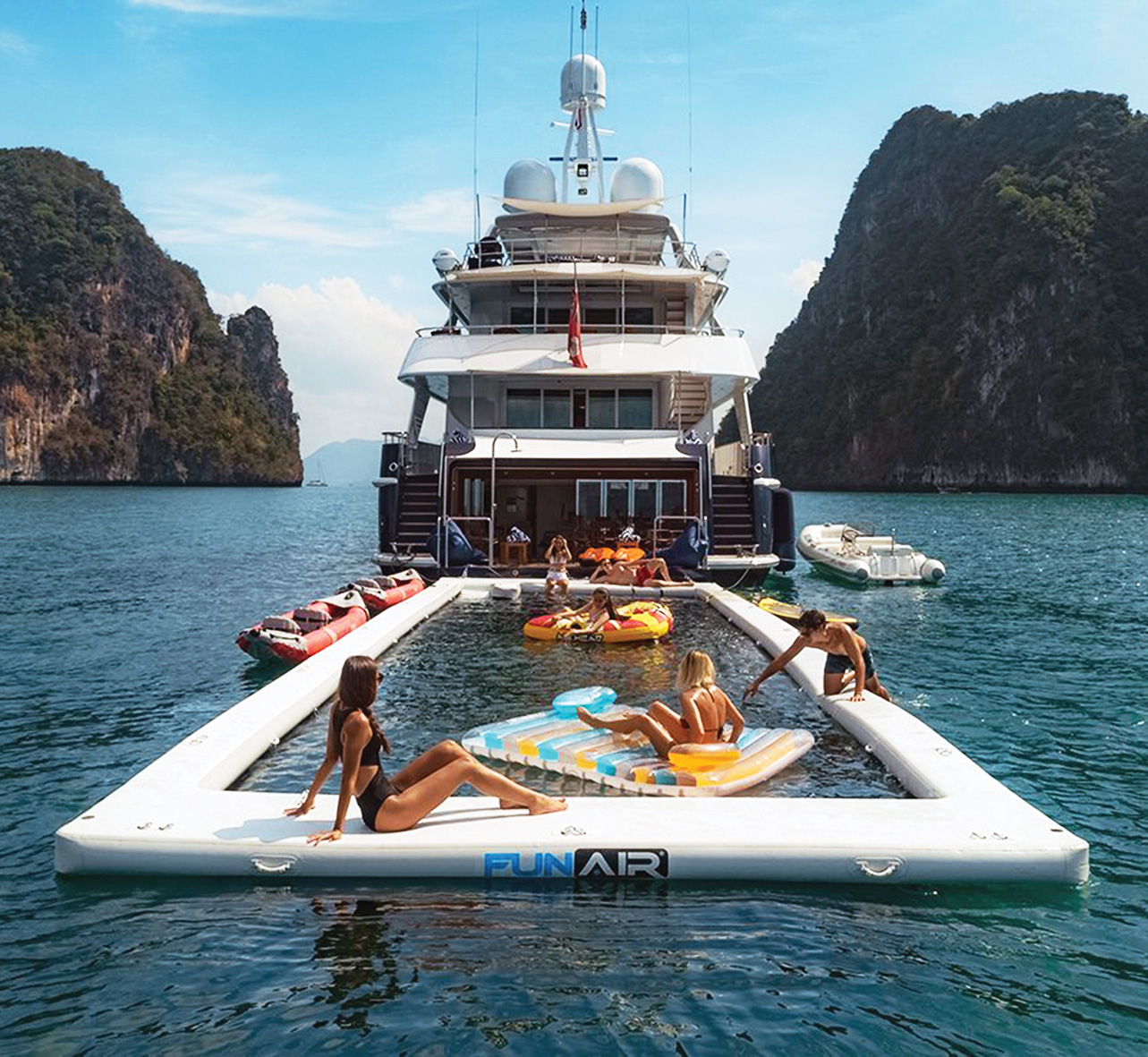 Podjetje FunAir iz Teksasa dela hud biznis s pomočjo zraka. Tega seveda obdajo s plastiko in prodajo bogatašem, lastnikom jaht, ki niso dovolj velike, da bi imele bazen, zato si ob svojem plovilu omislijo napihljivega. Najmanjši meri pet krat pet metrov, notranjost, ki je namenjena plavanju, je seveda malo skromnejša, na željo kupca pa ga izdelajo v katerikoli velikosti. S pomočjo priložene električne tlačilke so bazeni pripravljeni v petnajstih minutah do pol ure. Napihljivi rob dopolnjuje mreža, ki jahtaše ščiti pred meduzami ter ostalim morskim življem in skrbi, da neveščih ali od koktajlov omamljenih plavalcev tokovi ne bi odplaknili na odprto morje. K vsakemu bazenu sodi tudi lestev iz vrvi, petičneži pa ga lahko dopolnijo s pravimi napihljivimi stopnicami, po katerih elegantno zlezejo iz vode, z napihljivim toboganom, s pomočjo katerega se z vrha jahte zadrsajo v morje, ali napihljivo plezalno steno, po kateri splezajo iz morja in se potem spet poženejo vanj. Poglavje zase je napihljivo igrišče za golf z umetno travo na jahti, plavajočim otočkom z zastavico na morju ter žogicami, narejenimi iz hrane za ribe, da se v vodi v nekaj dneh razgradijo.