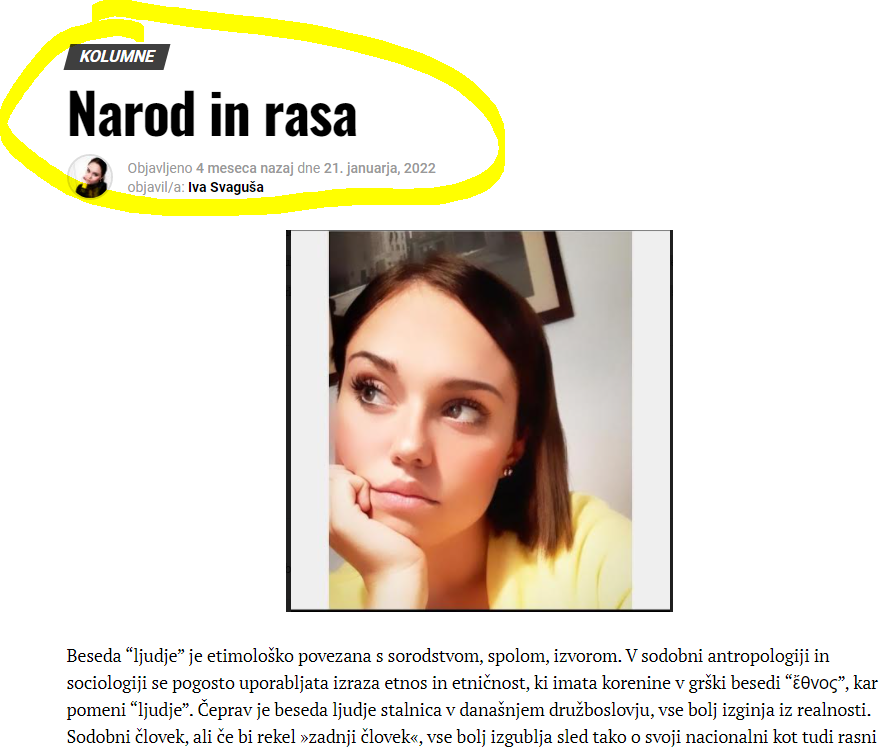 Slovensko novinarstvo se, če odštejemo nekaj izjem, nikoli ni odločilo zagristi v problem in zares problematizirati naštetih povezav in simpatij med najbolje organizirano stranko zadnjih desetletij in globalnim desnim ekstremizmom, kar nam verjetno bolje pojasni, kako in zakaj se je NTA znašla v razvidu medijev. V nadaljevanju bom poskušal dokazati, da s tem država in ministrstvo prevzemata odgovornost za odkrito sponzoriranje neonacistično obarvanega rasizma. Vendar se na tej točki razpre nov problem: živimo v državi, kjer se rasizma velikokrat ne zaznava kot res problematičnega in je težko ugotoviti, ali se ga sploh preganja. V nadaljevanju bom navedel zgolj eno od besedil na strani NTA, objavljeno 21. februarja 2022 pod naslovom »Narod in rasa« (https://nacionalnata.si/narod-in-rasa/).
