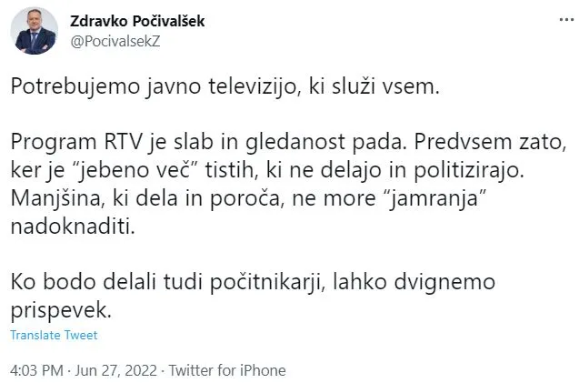 Odpisani minister Zdravko Počivalšek, prvak stranke Konkretno in pri KPK pravnomočno obtožen korupcije, je tokrat pristavil svoj lonček in pljunil po javni radioteleviziji v demagoškem slogu, ki se ga je dodobra priučil pri svojem šefu Janezu Janši: »Potrebujemo javno televizijo, ki služi vsem. Program RTV je slab in gledanost pada. Predvsem zato, ker je “jebeno več” tistih, ki ne delajo in politizirajo. Manjšina, ki dela in poroča, ne more “jamranja” nadoknaditi. Ko bodo delali tudi počitnikarji, lahko dvignemo prispevek.«