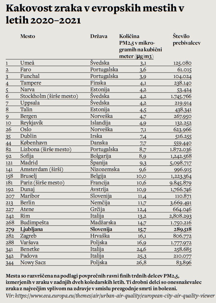 Ljubljana se je uvrstila na 279. mesto, to je med dvajset odstotkov najslabše uvrščenih mest. Dunaj je bil na 192. mestu in Maribor, kot edino drugo zajeto slovensko mesto, na 207. mestu. Maribor in Dunaj sta se uvrstila v skupino mest z »zmerno« onesnaženostjo (»moderate«), Ljubljana pa je v skupini mest s »slabo« kakovostjo zraka (»poor«), to je drugi najslabši skupini. Kot zanimivost: od 344 zajetih evropskih mest je bilo v najboljšo skupino, z »dobro« kakovostjo zraka, uvrščenih le enajst mest, med njimi tri švedska – vključno s prvouvrščenim mestom Umeå in od njega 600 kilometrov oddaljeno prestolnico Stockholm. V enajsterici sta od prestolnic še estonski Talin in islandski Reykjavik. Na nasprotni strani lestvice je od prestolnic najslabše uvrščena, na 288. mesto, poljska Varšava, ki je imela v letih 2020/21 povprečno 16,9 mikrograma delcev PM2,5 na kubični meter, predzadnji je Zagreb in nato že Ljubljana, ki je z vrednostjo 15,7 mikrogrami tretja najslabša prestolnica. Kot omenjeno, je priporočilo Svetovne zdravstvene organizacije, ki kot ključno merilo jemlje zaščito zdravja in na katero so se sklicevali zdravniki, od leta 2021 pet mikrogramov prašnih mikrodelcev na kubični meter. Mejne vrednosti Evropske unije so trenutno še precej višje.