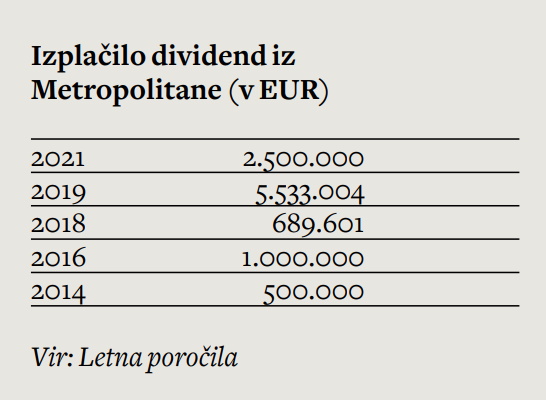 Letno poročilo skupine Metropolitana razkriva še dva pomenljiva podatka. Prvi je, da si je nadškofija iz Metropolitane, v katero se stekajo dividende GG Bled, zgolj lani izplačala 2,5 milijona evrov dividend. Od leta 2014 do lani, torej v obdobju po finančno-špekulativnem zlomu slovenske cerkve, je ljubljanska nadškofija iz Metropolitane pridobila skupaj 10,1 milijona evrov dividend.