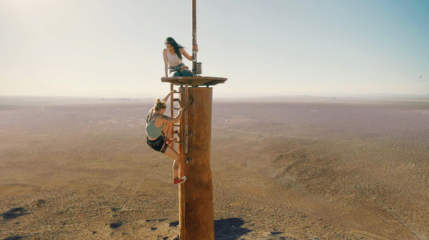 Ubogo Becky namreč obišče Hunter (Virginia Gardner), najboljša prijateljica, prav tako ekspertna plezalka (YouTube smeri), uživačica, ki jo zvleče v kalifornijsko puščavo, kjer stoji opuščeni radijsko-televizijski stolp, ki ga je za dva Eifflova stolpa, le da je tanjši, bolj ko ne le drog s stopnicami, ki ga pokonci drži kopica zajl. Ja, stolp je impozantna sedemstometrska pošast – sredi ničesar. Ja, Becky noče gor – nima ne volje, ne samozavesti. Ja, s Hunter po zdelanih, razmajanih, zarjavelih, razpadlih stopnicah vendarle splezata na vrh – škljocneta orgiastični instagramski selfi in katarzično raztrosita Danov pepel. In ja, ko se stopnice zrušijo, obtičita na vrhu tega gladkega, spolzkega, nestabilnega, hipnotičnega, faličnega, vrtoglavega droga – na mali platformi (v velikosti škatle za pico, kot pravita), ki jo maje veter in cvre sonce. Telefon ne dela, vrv je kratka, vode ni, torba jima je padla nekaj nadstropij nižje, ne moreta se premakniti, toda film jima omogoči, da vse, kar imata na sebi (spodnje perilo, copate, nogavice) in pri sebi (telefon, palico za selfije, daljnogled), prelevita v crescendo adrenalinskih in zelo kreativnih planov B (ki bi navdušili Čehova), obenem pa v tem minimalizmu in tej omejenosti najde več osupljivih in razburljivih neverjetnosti, kot jih najdete v vsem maksimalizmu Marvelovih superprodukcij – nekatere bodo postale referenčne, ja, klasike. Detektiv Scottie Ferguson (James Stewart), protagonist Hitchcockove Vrtoglavice, bi omedlel že ob pogledu na ta stolp – kaj šele ob pogledu z njega. Kaskaderji in direktor fotografije – MacGregor – res zasijejo. Akrofobija že dolgo ni bila tako imerzivna. A Hitchcockova Vrtoglavica sreča tudi Hitchcockove Ptiče, ko se protagonistk lotijo krvoločne ujede, Vrtoglavica in Ptiči pa srečajo še eno Hitchcockovo klasiko, Dvoriščno okno, ko protagonistki z višave nemočno mahata ljudem, ki ju ne vidijo. (kino)