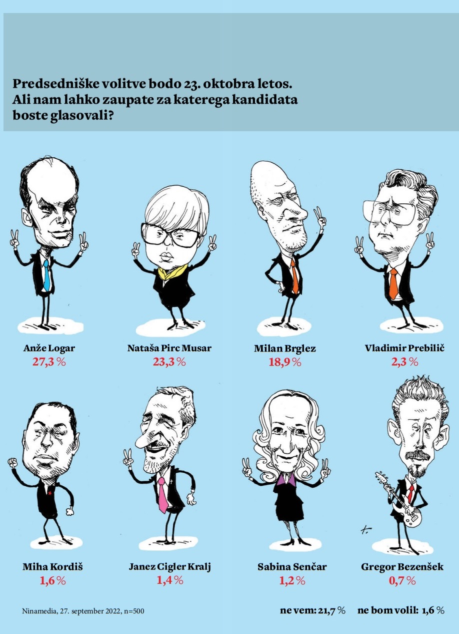 V tednu, ko so dokončno znani vsi kandidati, je tako mogoče na podlagi dosedanjih analiz javnega mnenja in sedanje ankete že ugotoviti, da imajo možnost za izvolitev na položaj predsednika republike trije kandidati: Nataša Pirc Musar, Anže Logar in Milan Brglez. Če primerjamo rezultate tokratne raziskave z rezultatom zadnjih parlamentarnih volitev, je mogoče razbrati, da so volivci SDS in NSi že napovedali večinsko podporo poslancu SDS in predsedniku sveta te stranke Anžetu Logarju, ki lahko seže torej do 35 odstotkov. Natašo Pirc Musar v tem trenutku podpira kar dobrih 60 odstotkov siceršnjih volivcev Gibanja Svoboda in del teh volivcev bo nedvomno prestopil med podpornike Milana Brgleza. Ideja ženske predsednice, ki je bila še sredi poletja velik pospešek kandidaturama Nataše Pirc Musar in Marte Kos, je zdaj potisnjena na obrobje, zdi se, da je bil njen naboj že porabljen. Glede na potencialno izenačenost treh vodilnih kandidatov (Brglezova podpora je v tem trenutku nižja tudi zato, ker je vanjo vstopil pozno) se bo volilna tekma v naslednjih tednih odvijala predvsem med Natašo Pirc Musar in Milanom Brglezom.