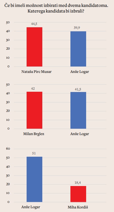Seveda smo volivce vprašali tudi o tem, koga bi podprli v drugem krogu. Agencija Ninamedia je tako izmerila tri možne pare: Anžeta Logarja in Natašo Pirc Musar, Anžeta Logarja in Milana Brgleza ter tudi Anžeta Logarja in Miho Kordiša. Zadnjo dvojico smo v javnomnenjsko anketo dodali predvsem zato, da bi preverili, kako močna je averzija javnosti do Kordiša in Levice: izkazalo se je, da imajo volivci sredinskih strank res večjo averzijo do Kordiša kot do drugega človeka SDS in desne roke Janeza Janše Anžeta Logarja – po podatkih javnomnenjske raziskave bi namreč Logar le v tem primeru gladko zmagal v drugem krogu. Če bi se v drugem krogu soočila Anže Logar in Nataša Pirc Musar, bi slednjo podprlo deset odstotkov več anketiranih in bi zelo verjetno zmagala in postala predsednica. Bolj napeto pa bi bilo, če bi se v drugi krog uvrstila Brglez in Logar, saj je njuna podpora praktično izenačena, Brglez vodi le za pol odstotne točke, kar je, ko gre za javnomnenjske raziskave, preprosto premalo, da bi lahko napovedali, da bi Brglez Logarja dejansko v drugem krogu tudi premagal. A taka so razmerja v tem trenutku, Brglezov domet se bo v naslednjih tednih še spreminjal.