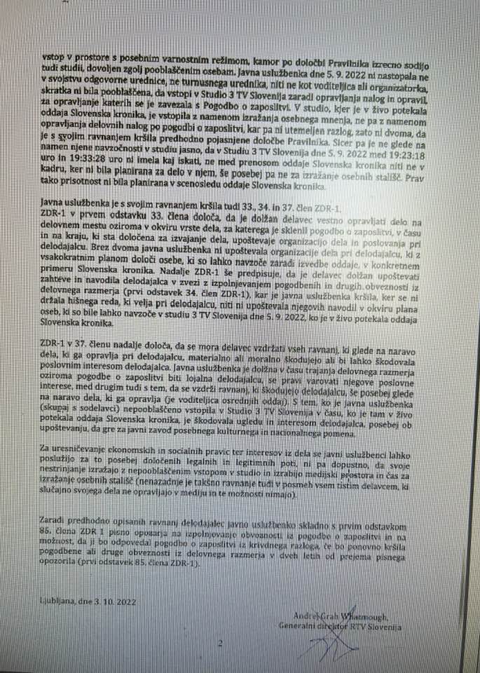 V opozorilu vodstva RTV je zapisano, da so sodelavci "nepooblaščeno vstopili v Studio 3 Televizije Slovenija (TVS) v času, ko se je Slovenska kronika predvajala v živo in za voditeljem v kadru stali 22 sekund". Na ta način so "programski čas, namenjen oddaji Slovenska kronika, izrabili za osebno izražanje mnenja in s tem nedopustno posegli v programsko shemo", je zapisalo vodstvo RTV.