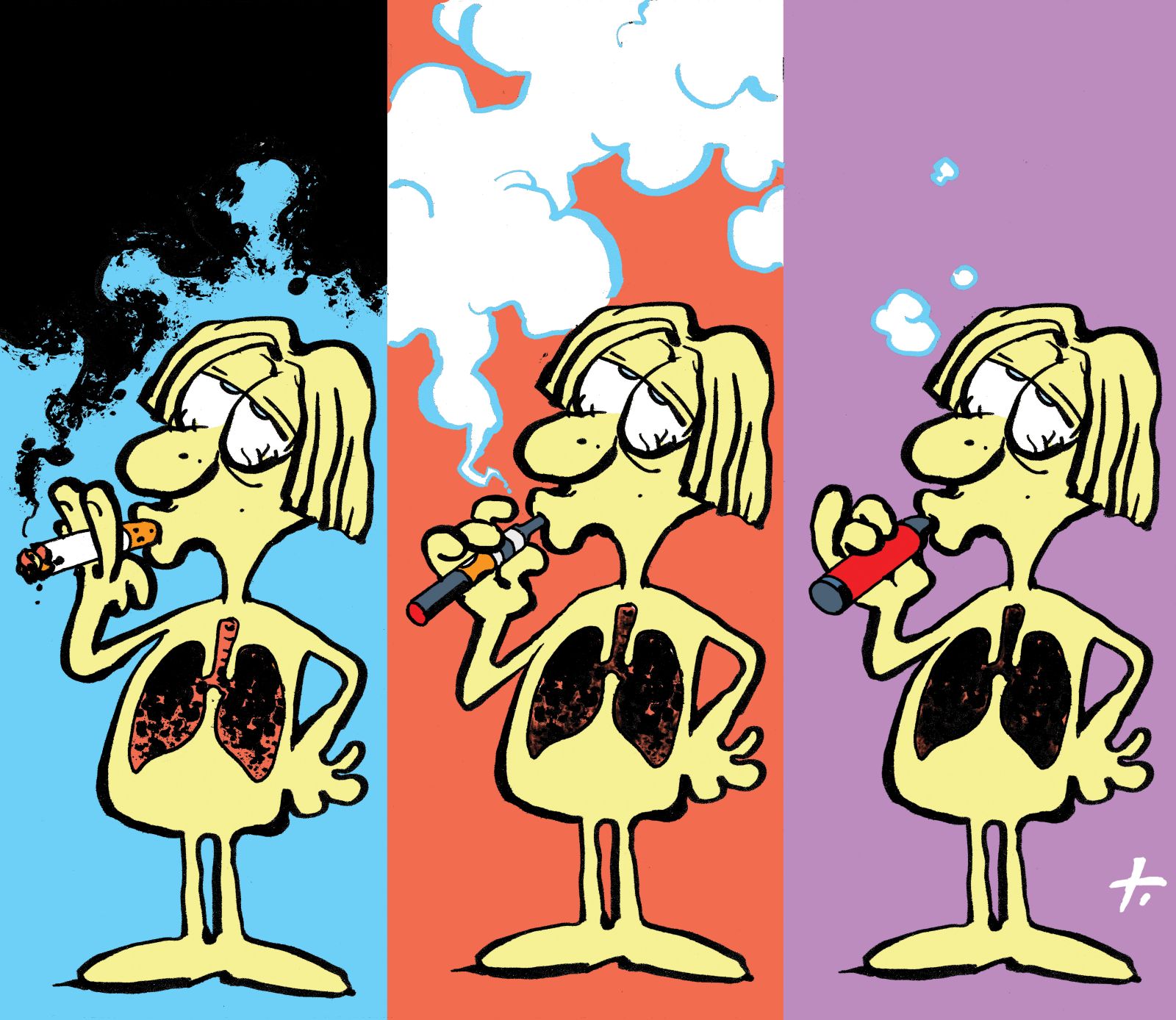 Če govorimo o posledicah kajenja e-cigaret, sta, odkar so te na trgu, nastala dva mnenjska tabora. V prvem elektronske cigarete dojemajo kot novo orodje tobačne industrije za indoktrinacijo kadilcev, vnovično normalizacijo kajenja in vzdrževanje vseživljenjske odvisnosti od nikotina. Za drugo skupino so elektronske cigarete manj škodljiv nadomestek klasičnih cigaret, z rabo katerega se pri kadilcih zmanjšuje tveganje za razvoj s kajenjem povezanih bolezni. Med strokovnjaki sicer še velja dokaj razširjeno prepričanje, da so elektronske cigarete verjetno manj škodljive od navadnih. Ni pa soglasja o tem, kako se z javnozdravstvenega vidika odzvati na njihov razmah. »Izdelka, ki bi bil manj škodljiv, ni, ker so vsi hitro zasvojljivi, to pa je namen tobačne industrije. Ta trg računa na zasvojenost vedno mlajših generacij, k čemur prispevajo tudi e-cigarete. Če bi šlo res samo za izdelke, ki pomagajo pri opuščanju kajenja, ti ne bi imeli okusa po vanilji in bi jih prodajali tudi v lekarnah,« pravi Neža Polh. Pri tem ni nepomembno, da se večina uporabnikov pravega učinka tobačnih izdelkov sploh ne zaveda. Koliko ljudi na primer ve, da je enourno kajenje vodne pipe ali šiše primerljivo s 50 do 200 pokajenimi cigaretami?