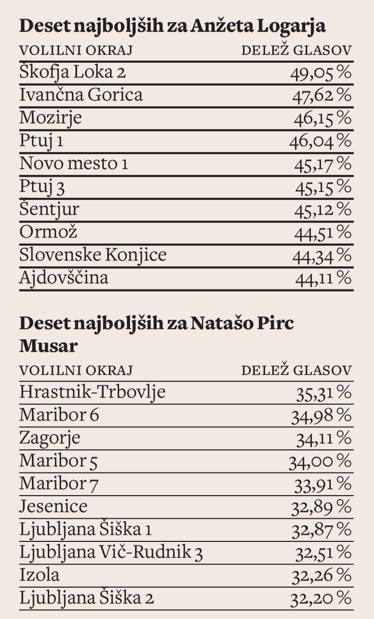 Nataša Pirc Musar je bila uspešna v bolj urbanih okoljih, Anžeta Logarja je premagala v 23 volilnih okrajih.
