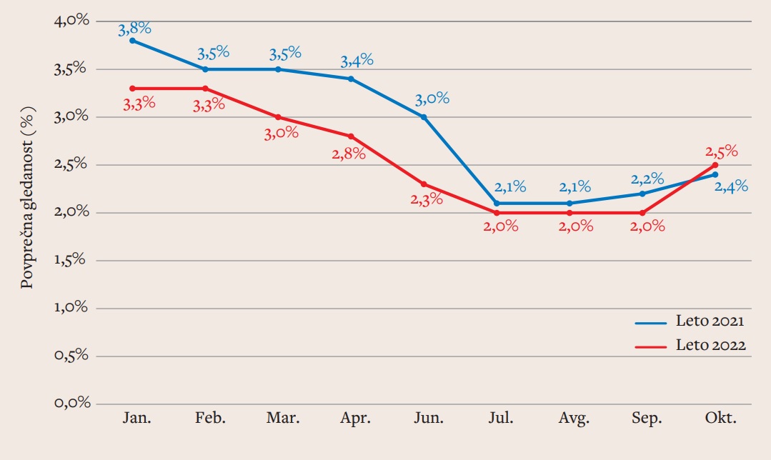 Graf prikazuje povprečno gledanost prvega programa TV Slovenija po mesecih, od januarja do septembra letos, starih več kot štiri leta. Podatki, ki smo jih črpali iz poročila o poslovanju RTV Slovenija januar–september 2022, sicer kažejo, da je gledanost prvega in drugega programa TV Slovenija je v prvih devetih mesecih letošnjega leta padla za okoli 10 odstotkov v primerjavi z istim obdobjem lani, poslušanost radia, v katerega novo generalno vodstvo RTV ni posegalo, pa se je v tem obdobju celo dvignila. Njegov dnevni doseg je narasel za 1,4 odstotne točke na 14,4 odstotka vseh poslušalcev.