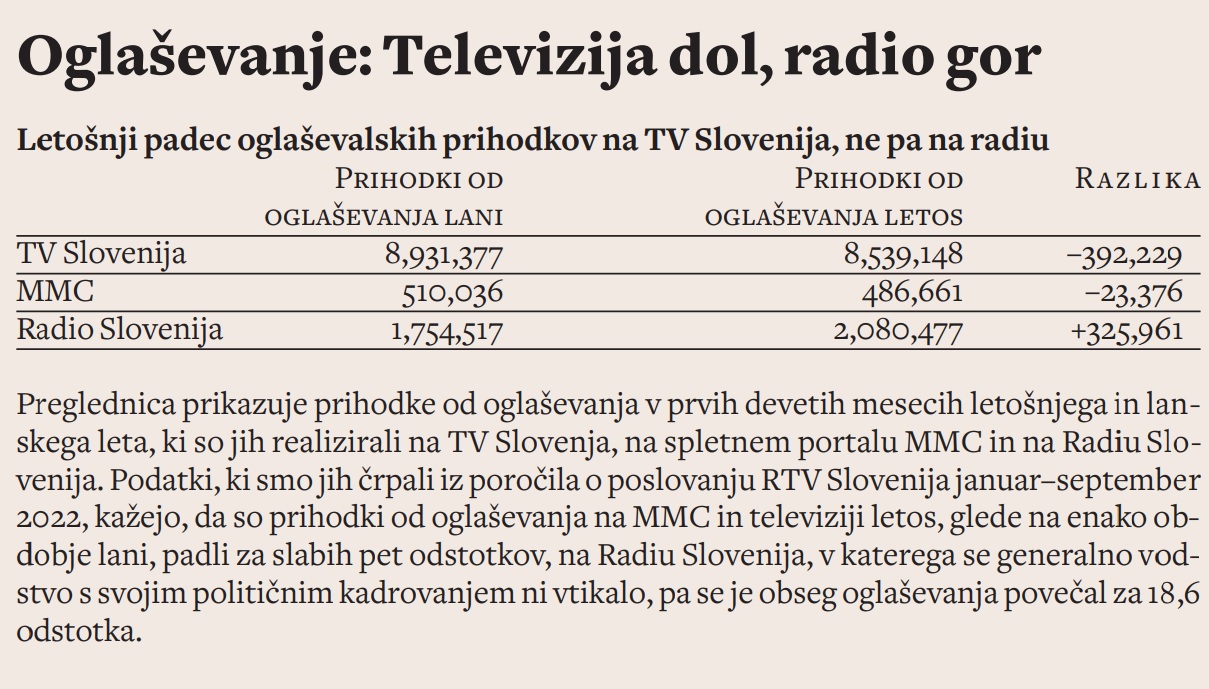 Padcu gledanosti pa je že letos sledil skokovit izpad oglaševalskih prihodkov. Generalno vodstvo se sicer hvali, da je RTV Slovenija v prvih devetih mesecih letošnjega leta imela več prihodkov kot odhodkov, in sicer v višini 1,31 milijona evrov. To je sicer res, a ta presežek je nastal v tistih delih RTV Slovenija, s katerimi se generalno vodstvo ni ukvarjalo. Nacionalkin najvišji prihodek, RTV-prispevek, je v prvih devetih mesecih letošnjega leta znašal 74 milijonov evrov. Na drugem mestu pa so prihodki od oglaševanja, ki so do septembra RTV Slovenija prinesli 11,7 milijona evrov. A najslabše sta se na tem področju odrezala televizija in MMC: obema so v letošnjem letu glede na lansko leto prihodki od oglaševanja padli za skoraj pet odstotkov, skupaj sta ti dve enoti glede na lansko leto zaslužili 415 tisoč evrov manj. Ta podatek je še toliko bolj porazen, če upoštevamo, da bo gospodarska rast letos po zadnji napovedi EU kar 6,2-odstotna, obseg oglaševanja pa navadno sledi gospodarski rasti. Poleg tega oglaševanje po epidemičnem letu 2020 hitro raste. Na Radiu Slovenija, v katerega se generalno vodstvo s svojim političnim kadrovanjem ni vtikalo, je recimo slika povsem drugačna: tam se je letos obseg oglaševanja povečal za 18,6 odstotka, glede na lani je to skok v višini 326 tisoč evrov.