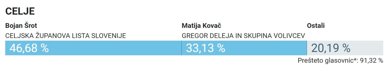 Volivci v Celju so aktualnega župana Bojana Šrota, ki občino vodi že 24 let, na današnjih lokalnih volitvah poslali v drugi krog. Namenili so mu nekaj več kot 47 odstotkov glasov, v drugi krog pa se je uspelo uvrstiti tudi neodvisnemu kandidatu Matiji Kovaču, ki je po več kot 00 odstotkih preštetih glasov prejel dobrih 32 odstotkov glasov.