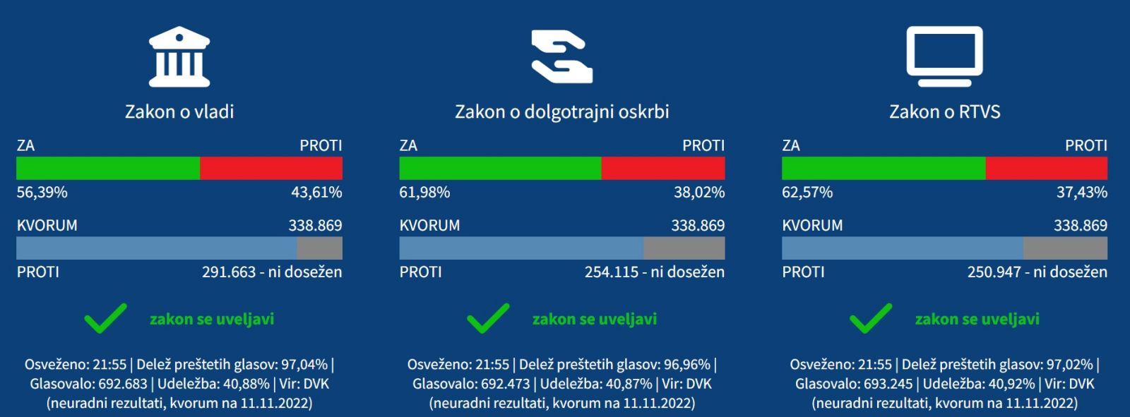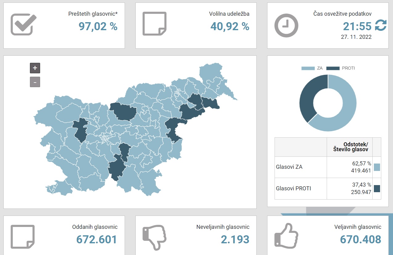 V nedeljo ob 19. uri so se zaprla volišča po Sloveniji. Po veliki večini preštetih glasov kaže, da so bili na referendumu potrjeni vsi trije vladni zakoni. Državna volilna komisija (DVK) na spletni povezavi volitve.dvk-rs.si sproti sporoča rezultate preštetih glasovnic; za zdaj je razvidno, da je približno 62 odstotkov volivk in volivcev glasovalo ZA novelo zakona o RTV Slovenija, približno toliko ZA zakon o dolgotrajni oskrbi ter nekoliko manj (56 odstotkov) ZA zakon o vladi.