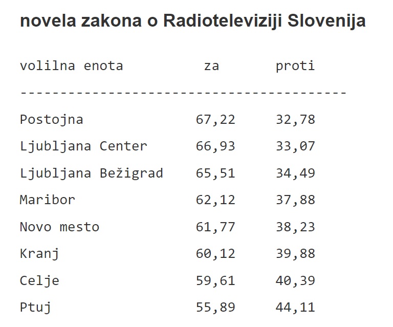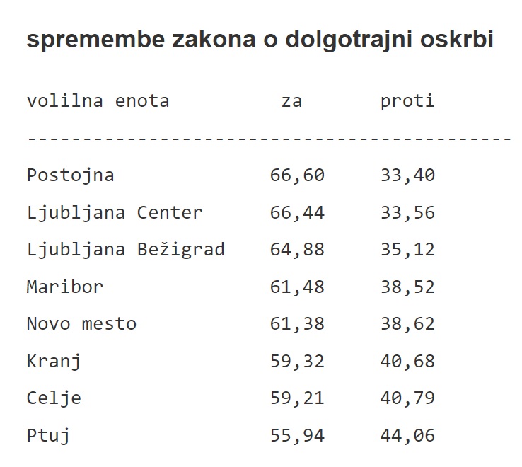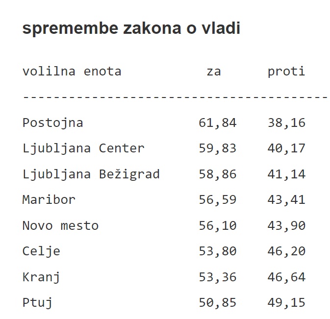Delež tistih, ki so glasovali za vladne zakone, je bil najvišji v volilni enoti Postojna (sledita Ljubljana Center in Ljubljana Bežigrad), najnižji pa v volilni enoti Ptuj
