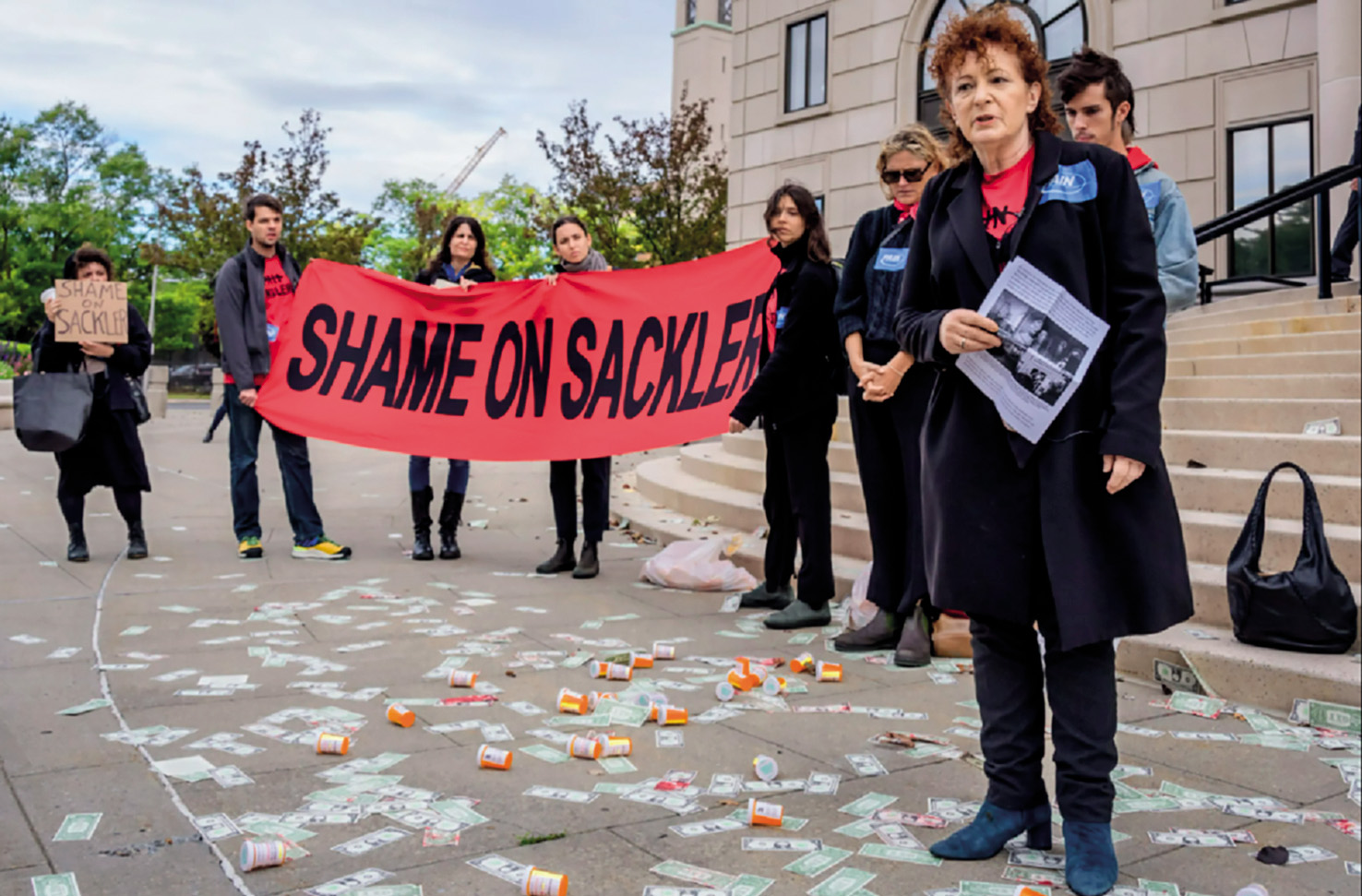 Nan Goldin, ameriška fotografka in aktivistka, je le 2018 organizirala protest v newyorškem Metropolitanskem muzeju umetnosti – od uprave ne le tega muzeja, ampak vseh muzejev in sorodnih institucij, je terjala, naj nehajo sprejemati donacije bogate in mogočne dinastije Sackler, sicer lastnice farmacevtske družbe (Purdue Pharma), ki je Ameriko navlekla na OxyContin, adiktivni protibolečinski opioid. »Sacklerji lažejo, ljudje umirajo,« vpijejo protestniki, ki ležijo na tleh – in se delajo mrtve. OxyContin je ubil mnoge. Ja, Sacklerji – »Družina, ki je zgradila imperij bolečine« (kot je pred leti zapisala revija New Yorker) – so lagali, da OxyContin ni adiktiven in destruktiven. In ja, ker so jim ljudje verjeli in ker so jim ga zdravniki predpisovali, so se vsi nanj navlekli, tudi Nan Goldin, ki je skoraj umrla in potem ustanovila aktivistično organizacijo P. A. I. N. (Prescription Addiction Intervention Now), njen boj proti establišmentu, ki je ljudi tako mirno prepustil opioidom, kot jih je malce prej prepustil aidsu (in malce kasneje covidu), pa je zlagoma bogato obrodil – Sacklerje, ki so ljudi namerno navlekli na svoje droge (profiti pred zdravjem!), so črtali.