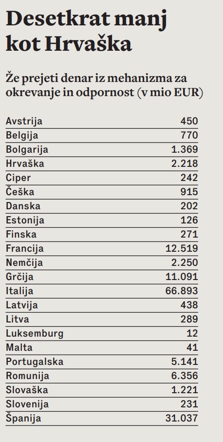 In kje smo danes s črpanjem denarja iz mehanizma za okrevanje in z uresničevanjem projektov? Od skupnih 724 milijard evrov je sicer do tega tedna po podatkih števca evropske komisije državam EU nakazanih skoraj 97 milijard evrov nepovratnih sredstev in 47 milijard evrov posojil. Od tega je daleč največ, skupno 67 milijard evrov, že dobila Italija, večino še pod Mariem Draghijem, predhodnikom desničarske premierke Giorgie Meloni. Italija bo sicer iz evropskega mehanizma do konca leta 2026 po načrtih črpala 69 milijard evrov nepovratnih sredstev in skoraj 123 milijard evrov posojil. Slovenija je od skupaj potrjenih 1,49 milijarde evrov nepovratnih sredstev in 705 milijonov evrov posojil doslej dobila nakazano le predplačilo 231 milijonov evrov nepovratnih sredstev, in sicer septembra 2021. Oktobra lani je vlada v Bruselj poslala zahtevek za prvi obrok nepovratnih sredstev v višini 50 milijonov evrov. Ta denar naj bi po nedavnih napovedih finančnega ministra Klemna Boštjančiča dobili do konca marca, v torek pa je STA, sklicujoč se na vire pri evropski komisiji, poročala, da bo marca denar predvidoma res odobren, dejansko izplačilo pa bo sledilo naslednji mesec.
