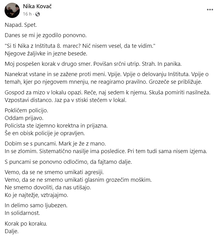 Nika Kovač je dogodek opisala na Facebooku: “Njegove žaljivke in jezne besede. Moj pospešen korak v drugo smer. Povišan srčni utrip. Strah. In panika. Naenkrat vstane in se zažene proti meni. Vpije. Vpije o delovanju Inštituta. Vpije o temah, kjer po njegovem mnenju, ne reagiramo pravilno. Grozeče se približuje."