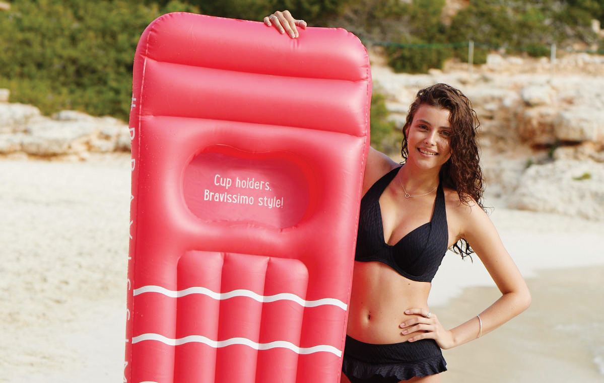 Prvoaprilska šala, ki jo je pred petimi leti na družabnih medijih objavila britanska znamka spodnjega perila Bravissimo – ta sicer z nedrčki in kopalkami že malo manj kot tri desetletja nudi oporo ženskam z mogočnejšim oprsjem –, je požela huronsko navdušenje med sledilkami. Objavili so namreč potegavščino, da razvijajo posebno napihljivo blazino z vgrajeno vdolbino, s pomočjo katere bodo lahko med počitnicami med ležanjem na trebuhu končno uživale tudi bolj obdarjene uporabnice. Nepričakovani odziv jih je spodbudil, da je zadeva še istega poletja postala meso oziroma polivinilklorid. Lilo, kot napihljivi blazini rečejo na otočju, je vse odtlej naprodaj v njihovih trgovinah in na spletu. Glede na to, da sicer prodajajo le perilo s košaricami v velikostih od D do L, je vrzel v napihnjeni blazini bržkone dovolj globoka zanje. Hkrati se pri omenjeni vboklini poigravajo z dvojnim pomenom, ki ga ima besedna zveza cup holders, držala za kozarce oziroma skodelice, kakor v angleščini imenujejo tudi košarice pri nedrčkih. Napihljivke izdelujejo na Kitajskem, v intenzivno rožnati barvi.