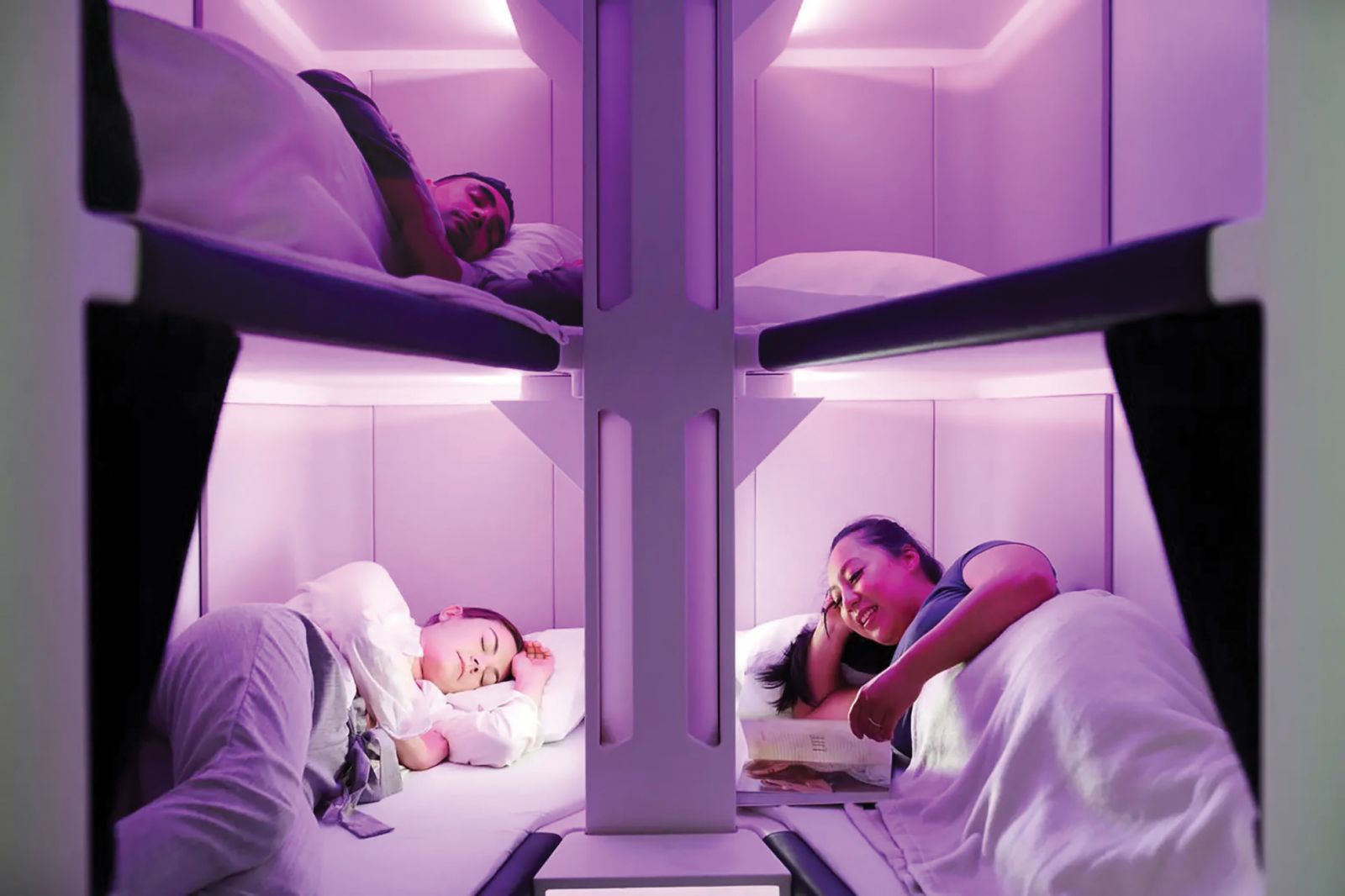 Na enem najdaljših letalskih poletov, med Aucklandom in New Yorkom, ki traja več kot 17 ur, naj bi potnikom družbe Air New Zealand že prihodnje leto omogočili počitek na posteljah v ekonomskem razredu. Pravzaprav bo šlo za skupek pogradov, ki so jih poimenovali gnezdo na nebu (sky nest). Vgrajevali jih bodo v letala tipa Boeing 787 Dreamliner, ki imajo v posebnem delu, nad potniškim, tudi skrivni prostor s posteljami, namenjen počitku pilotov in ostale posadke. Ker je sedežev na letalu veliko, pogradov pa bo samo šest, jih bodo potniki lahko najeli za štiriurni počitek; tako se jih bo med prekooceanskim poletom na ležiščih zvrstilo kar nekaj. Na dvometrski postelji jim bodo na voljo čepki za ušesa in bralna lučka, posteljnino pa bodo seveda preoblekli, ko se bodo uporabniki zamenjali. Letalski prevoznik Air New Zealand potnikom na daljših poletih že zdaj ponuja tako imenovani kavč na nebu (skycouch), pri katerem lahko ceneje zakupijo tri vzporedne sedeže in jih uporabljajo kot kavč, dolg nekaj več kot poldrugi meter – zase ga lahko na primer celega najamejo posamezniki ali pa ga starši delijo z otroki.