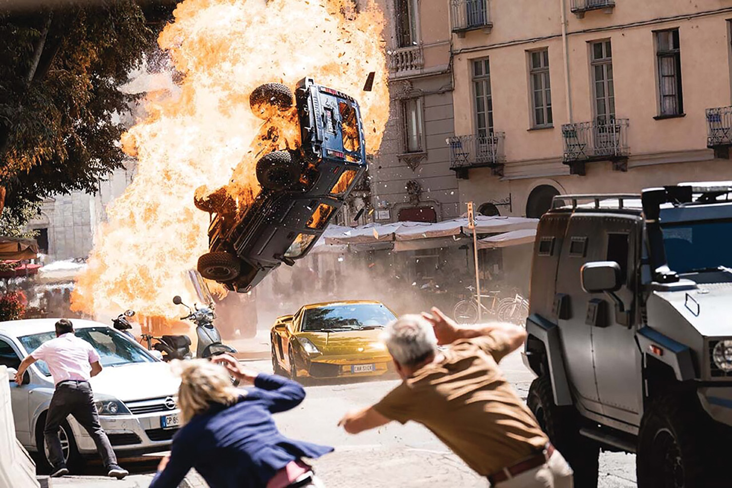 Avtorji Hitrih in drznih X so očitno gledali Spielbergov Lov za izgubljenim zakladom in si ob prizoru, v katerem Indiano Jonesa preganja orjaška krogla, rekli: kaj bi lahko naredili s to kroglo? Tole: ko hitre in drzne – Dominica Toretta (Vin Diesel) in njegovo razširjeno družino (»sekto z avtomobili«, kot pripomni nekdo) – pošljejo na misijo v Rim, iz blindiranega vozila, ki ga skušajo oropati, plane orjaška krogla, de facto masivna bomba, ki se začne valiti po Rimu in gaziti vse pred sabo – avti in motorji letijo po zraku, kot bi jih katapultirali. Krogla bombastično drvi proti Vatikanu, Dom pa naredi vse, da bi jo zabremzal. Vatikan ne sme pasti! V Hitrih in drznih X, ki očitno – kot vsak grand finale velikih franšiz – prihajajo v dveh delih (ta del se konča s cliffhangerjem, s kakršnim so se nekoč, v tridesetih in štiridesetih letih prejšnjega stoletja, zaključevale epizode holivudskih akcijskih serijalov, originalnih predhodnikov sodobnih akcijskih filmov), je pač vse orjaško, velikansko, monumentalno, rekordno.