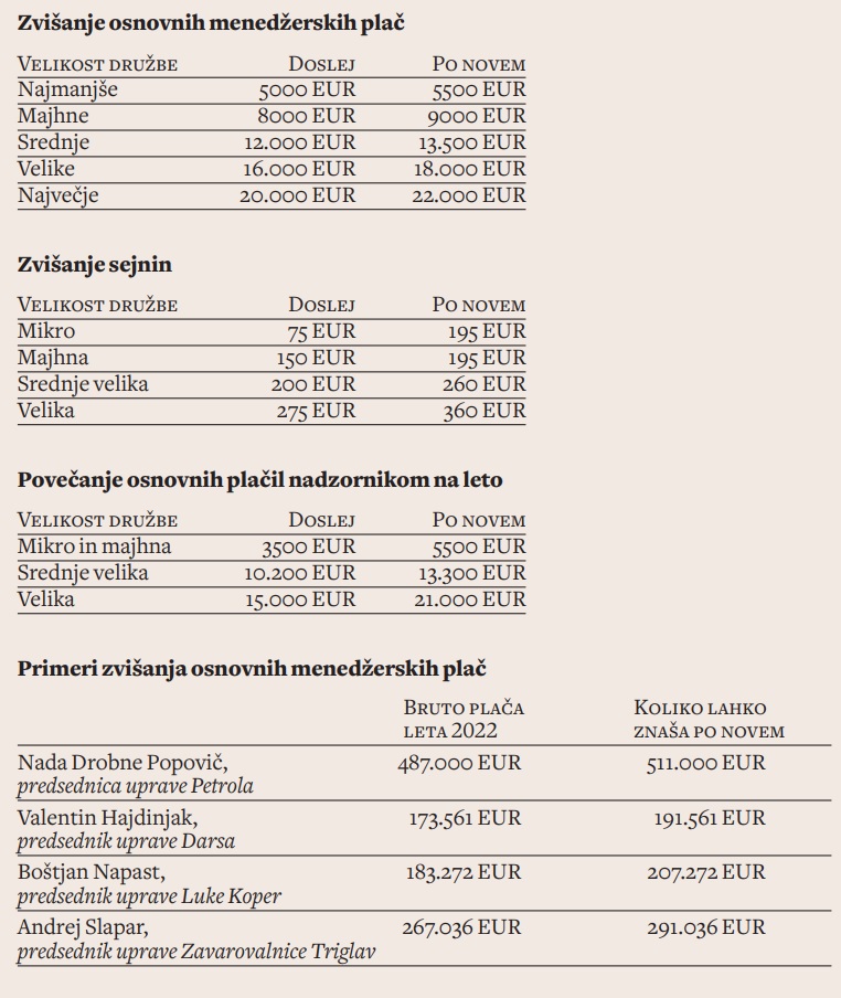 Poleg plač se povečujejo tudi prejemki nadzornikov. Minimalna urna postavka za študentsko delo od januarja letos znaša bruto 6,92 evra, kar je najnižje plačilo, na katero lahko računa občasni delavec za uro dela v Sloveniji. Plačilo za delo nadzornikov, torej sejnine, je seveda višje. Doslej so po priporočilih SDH in v odvisnosti od velikosti podjetja te znašale od 75 do 275 evrov na sestanek. SDH po novem najnižje priporočene sejnine zvišuje za kar 260 odstotkov, s 75 evrov na 195, najvišje pa za 25 odstotkov, z 275 evrov na 360. Seveda nadzorniki poleg sejnin dobivajo še osnovno plačilo za opravljanje funkcije, ki se zvišuje še bolj: pri najmanjših družbah za okoli 40 odstotkov, s 3500 na 5500 evrov na leto, pri velikih pa za okoli 30 odstotkov, s 15 tisoč na 21 tisoč evrov na leto. Žiga Debeljak, ki poleg vodenja SDH opravlja še funkcijo predsednika nadzornega sveta Telekoma in Gen energije – v Telekomu je za lanske tri mesece prejel 11.825 evrov bruto –, bo tako letos poleg osnovne plače prejel verjetno dodatno še vsaj okoli 70 tisoč evrov.