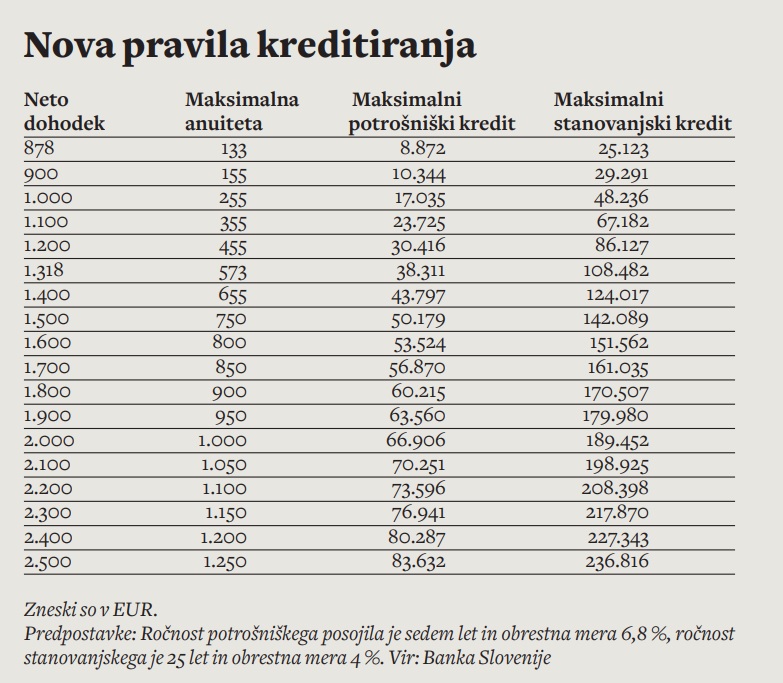 Nova pravila kreditiranja je minuli teden predstavila Banka Slovenije, ključna novost pa je, da niso več vezana na gibanje minimalne plače. Po starih pravilih oziroma zakonu je namreč moral vsem kreditojemalcem po plačilu obroka posojila ostati na računu znesek v višini vsaj 76 odstotkov minimalne bruto plače, z vsakim dvigom minimalne plače pa se je znižala kreditna sposobnost velikega dela prebivalstva, zlasti je to vplivalo na posameznike s »srednjimi« plačami, torej okoli povprečne. Že aprila je bila vezava na minimalno plačo odpravljena s spremembo zakona, Banka Slovenije pa je morala postaviti nova pravila. In kakšna so? Novi minimalni znesek, ki mora potrošniku vsak mesec ostati na računu po plačilu vseh obrokov iz kreditnih pogodb, je 745 evrov (prej 915 evrov), kolikor znašajo minimalni življenjski stroški. Po novem lahko banke pri izračunu letnega dohodka potrošnika upoštevajo tudi otroške dodatke in nekatere druge socialnovarstvene prejemke, ki so bili doslej izključeni. Če potrošnik na primer preživlja družinskega člana, pa mu mora po plačilu mesečnih obveznosti še naprej ostati na računu znesek za vzdrževane družinske člane. Novost je tudi, da letni strošek servisiranja dolga v nobenem primeru, niti pri visokih dohodkih, ne sme preseči 50 odstotkov letnega neto dohodka kreditojemalca.
