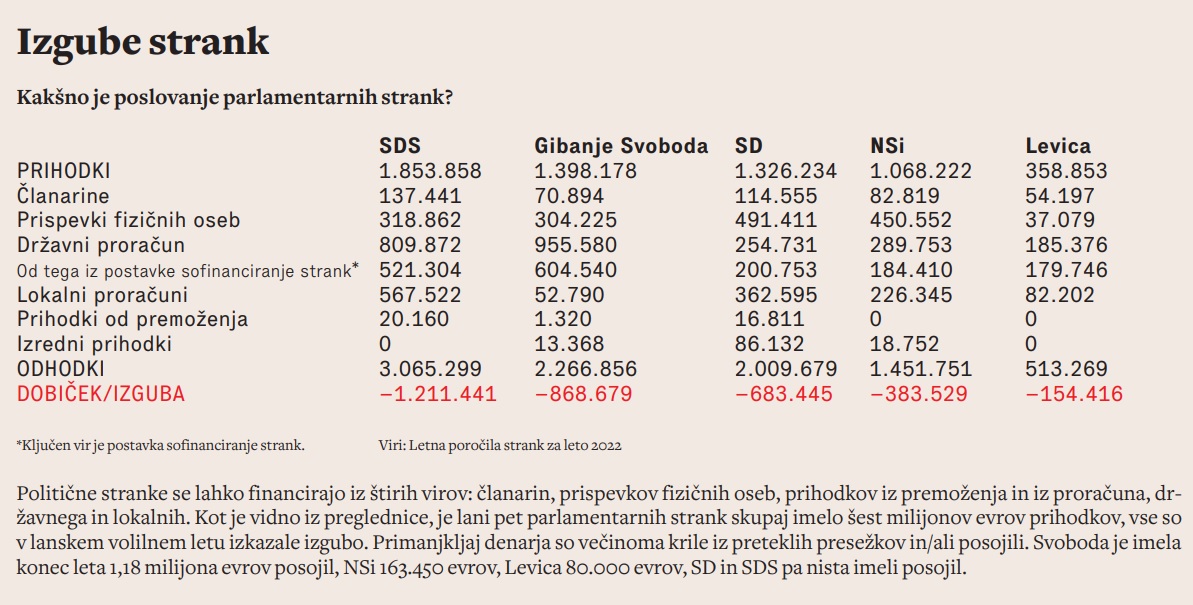 A odločitev o več denarja je bil le del načrta. Tri tedne so politične stranke, ki drugače nimajo milosti pri medsebojnem obračunavanju, tiho in stran od oči javnosti pripravljale drugi del svojega »Načrta za okrevanje in odpornost«, s katerim so si v času boja zoper rast inflacije in vse višjo porabo odprle tudi zakonska vrata za bistveno več proračunskega denarja za svoje delovanje. Od omenjenih dveh manevrov, torej sklepa kolegija državnega zbora in hkrati sprejetih sprememb zakona o političnih strankah, bosta daleč največje koristi imela Gibanje Svoboda Roberta Goloba in SDS Janeza Janše, ki bosta že prihodnje leto delovala z bistveno več proračunskega denarja. Gibanje Svoboda, ki letos razpolaga s slabim milijonom proračunskega denarja, bo imelo prihodnje leto na voljo več kot dva milijona evrov, SDS, ki ima letos dobrega pol milijona, pa bo iz proračuna prihodnje leto dobila vsaj 1,15 milijona evrov. Za kako velik dvig sofinanciranja gre, nam pove podatek, da je imelo pet parlamentarnih strank iz vseh virov v letu 2022 šest milijonov evrov prihodkov, zdaj pa bodo zgolj iz proračuna dobile skoraj pet milijonov evrov – manjši del bo namreč dodeljen zunajparlamentarnim strankam.