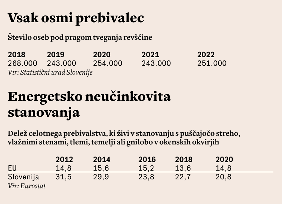 Že zdaj si v Sloveniji skoraj 10 odstotkov gospodinjstev pod pragom revščine ne more zagotoviti primerno ogrevanega stanovanja, v primerjavi z drugimi državami članicami EU pa je za Slovenijo značilen nadpovprečno velik delež izdatkov za energijo v celotni porabi gospodinjstev (5,2 odstotka v primerjavi s 4,1 odstotka). Obenem se Slovenija uvršča med države z največjim deležem populacije, ki zamujajo s plačili stanovanjskih stroškov in živijo v energetsko neučinkovitih stanovanjih, kjer sta prisotni vlaga in plesen.