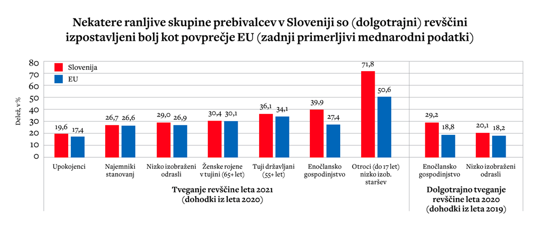 Za Slovenijo je značilno, da so tveganju revščine nekatere skupine izpostavljene precej bolj, kot to velja za povprečje EU: to so zlasti enočlanska gospodinjstva, upokojenci in starejši od 65 let, nizko izobraženi ter invalidi. Tveganju revščine je izpostavljena vsaka druga samska ženska nad 65 let, vsaka peta enostarševska družina in vsak deseti otrok v Sloveniji. Po podatkih Eurostata je bilo tveganju revščine leta 2021 izpostavljenih 39,9 odstotka enočlanskih gospodinjstev (povprečje v EU je bilo 27,4 odstotka) in kar 71,8 odstotka otrok nizko izobraženih staršev, torej staršev s končano najmanj osnovnošolsko izobrazbo (povprečje v EU je bilo 50,6 odstotka). Podobno velja, da so te skupine bolj izpostavljene tudi dolgotrajni revščini: leta 2020 je bilo za več kot 10 odstotnih točk več enočlanskih gospodinjstev izpostavljenih dolgotrajni revščini, kot velja za povprečje EU, za dve odstotni točki več, kot velja za povprečje EU, pa nizko izobraženi odrasli. Slovenija se, ko gre za najbolj ogrožene skupine, v primerjavi z EU torej srečuje z večjim tveganjem (dolgotrajne) revščine, podobno kot velja, da je ta revščina globlja.