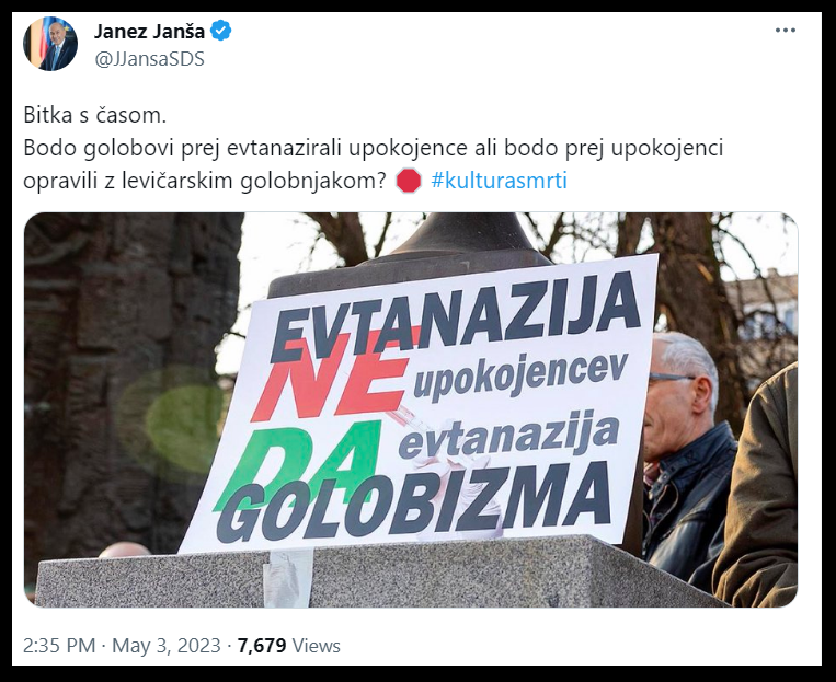 Sam si bom zastavil vprašanje, ali morda k temu ne prispevata slaba pripravljenost na strokovno razpravo ali indiferenca, ki jo zmore Golobova koalicija, s čimer se odpira prostor očitkom proti evtanaziji? Je vladajoča politika postala dovzetna za zgrešena prepričanja in zmote, ki jih širijo nasprotniki zakona, najbolj značilno pa ravno Janšev ideološki stroj?
