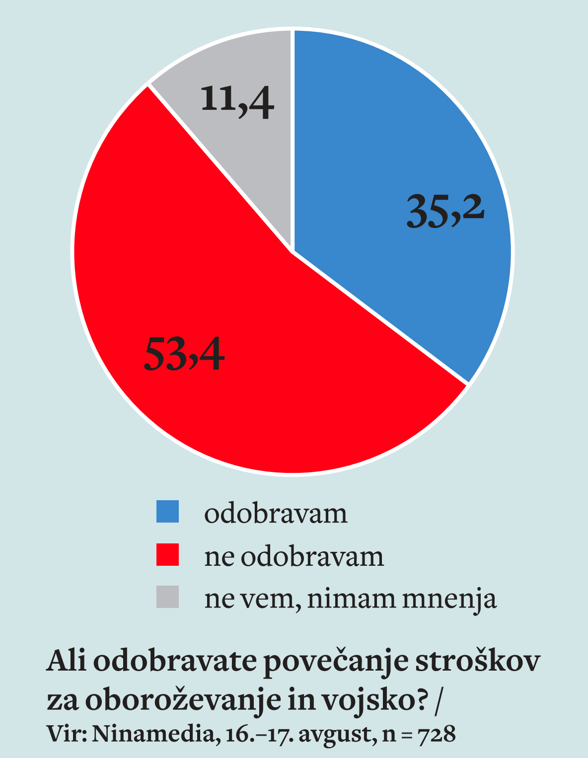 Šarec si želi, da bi bilo po poplavah v javnosti več podpore za nakup osemkolesnikov, a ljudje vendarle niso slepi. To dokazuje tudi zadnja javnomnenjska anketa o nakupovanju vojaške opreme, ki jo je Ninamedia opravila 16. in 17. avgusta. Letos naj bi slovenski stroški za oboroževanje in vojsko dosegli približno 850 milijonov evrov, prihodnje leto naj bi presegli milijardo. Ali osebno odobravate povečanje stroškov za oboroževanje in vojsko, so anketarji vprašali respondente. Več kot polovica, 53,4 odstotka, jih je odgovorila, da teh izdatkov ne odobravajo. Povsem drugačni bi verjetno bili odgovori na vprašanje glede pomoči, ki jo je vojska zagotovila ob zadnjih poplavah.
