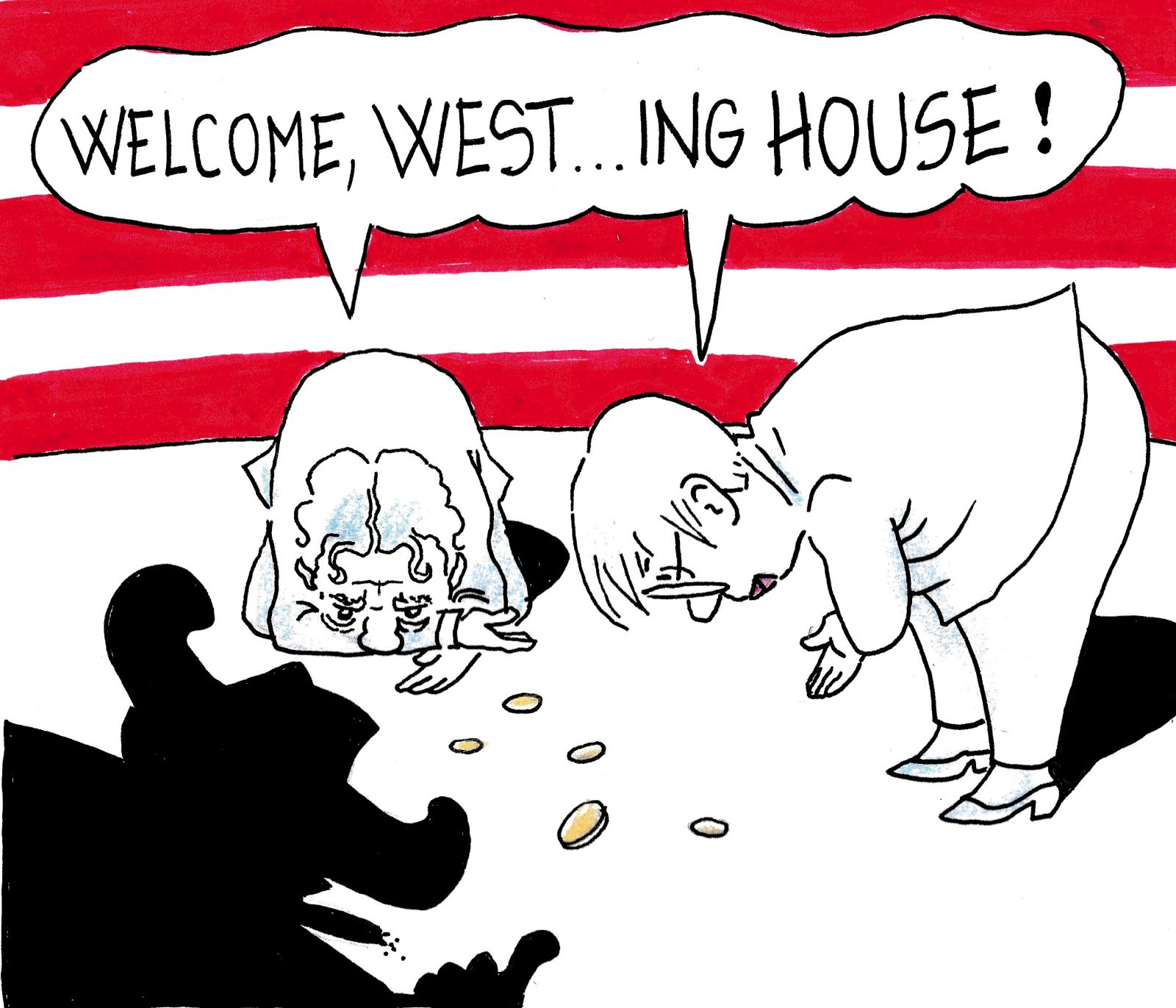 Da je ameriško kongresno delegacijo sprejel ves državni vrh, na čelu s premierom in predsednico republike, ne kaže na pomembnost obiska, ampak na pritlikavost države gostiteljice; nizko samozavest in dostojanstvo njenih voditeljev. Če bi, obratno, slovenska parlamentarna delegacija šla na obisk v ZDA, bi najbližje srečanje z ameriško administracijo doživela v stiku z varnostnikom, ki bi Grimsu prešlatal žepe, Jelki Godec prebrskal torbico, Ivi Dimic pa prelistal molitvenik ...