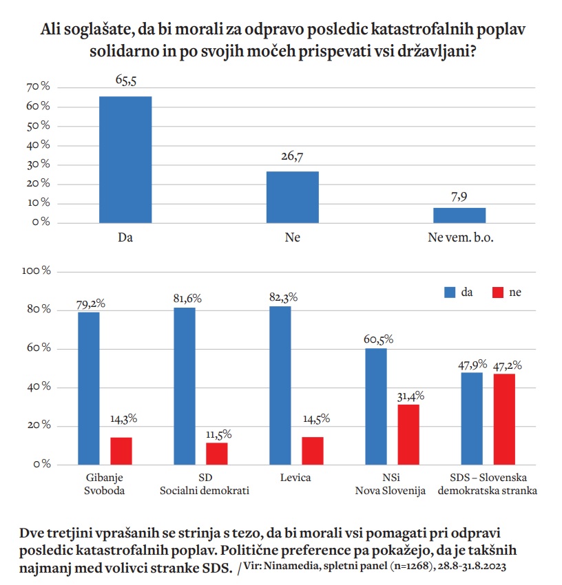 A ne vsi. Raziskava javnomnenjske agencije Ninamedia kaže nenavadno sliko. Na vprašanje, ali anketiranci soglašajo s tezo, da bi morali za odpravo posledic katastrofalnih poplav solidarno in po svojih močeh prispevati vsi državljani, sta skoraj dve tretjini vprašanih (65,5 odstotka) odgovorili pritrdilno. Izražen solidarnostni konsenz pa je odvisen od političnih prepričanj. Podporniki koalicijskih strank solidarnostne ukrepe podpirajo nadpovprečno, volivci NSi podpovprečno (60,5 odstotka), podporniki SDS pa izrazito odstopajo v negativni smeri. Idejo, da vsak prispeva po svojih zmožnostih, podpira le 47,9 odstotka volivcev SDS. Izraženo s številkami to pomeni, da naj bi bili volivci SDS za slabih 30 odstotkov manj naklonjeni zamisli o solidarnostni pomoči, kot pa naj bi bilo povprečje v Sloveniji.
