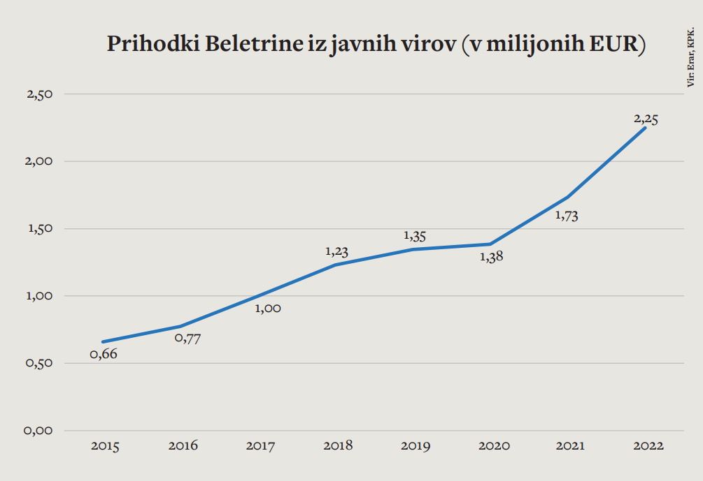 Beletrina je nekdanja Študentska založba, ki jo je marca 2021 dokončno sprivatiziral podjetnik Mitja Čander. Zgolj v zadnjih treh letih je povečala prihodke z 2,6 na 3,4 milijona evrov. Zvišanje je šlo zlasti na račun dodatnega poslovanja z javnimi institucijami, kaže baza javnih naročil Erar. Ob knjigah in založništvu postaja nov Beletrinin adut za črpanje javnega denarja digitalizacija. A omenjeni finančni bum založbe je povezan s sodelovanjem z Janševo vlado, ki jo je Čander javno in tudi sicer podpiral ter z njo sodeloval. Pod Janševo vlado je Beletrina tudi dobila status nevladne organizacije, ki deluje (ob knjigi) tudi v javnem interesu razvoja informacijske družbe. To ji je seveda odprlo predvsem nova razpisna vrata.