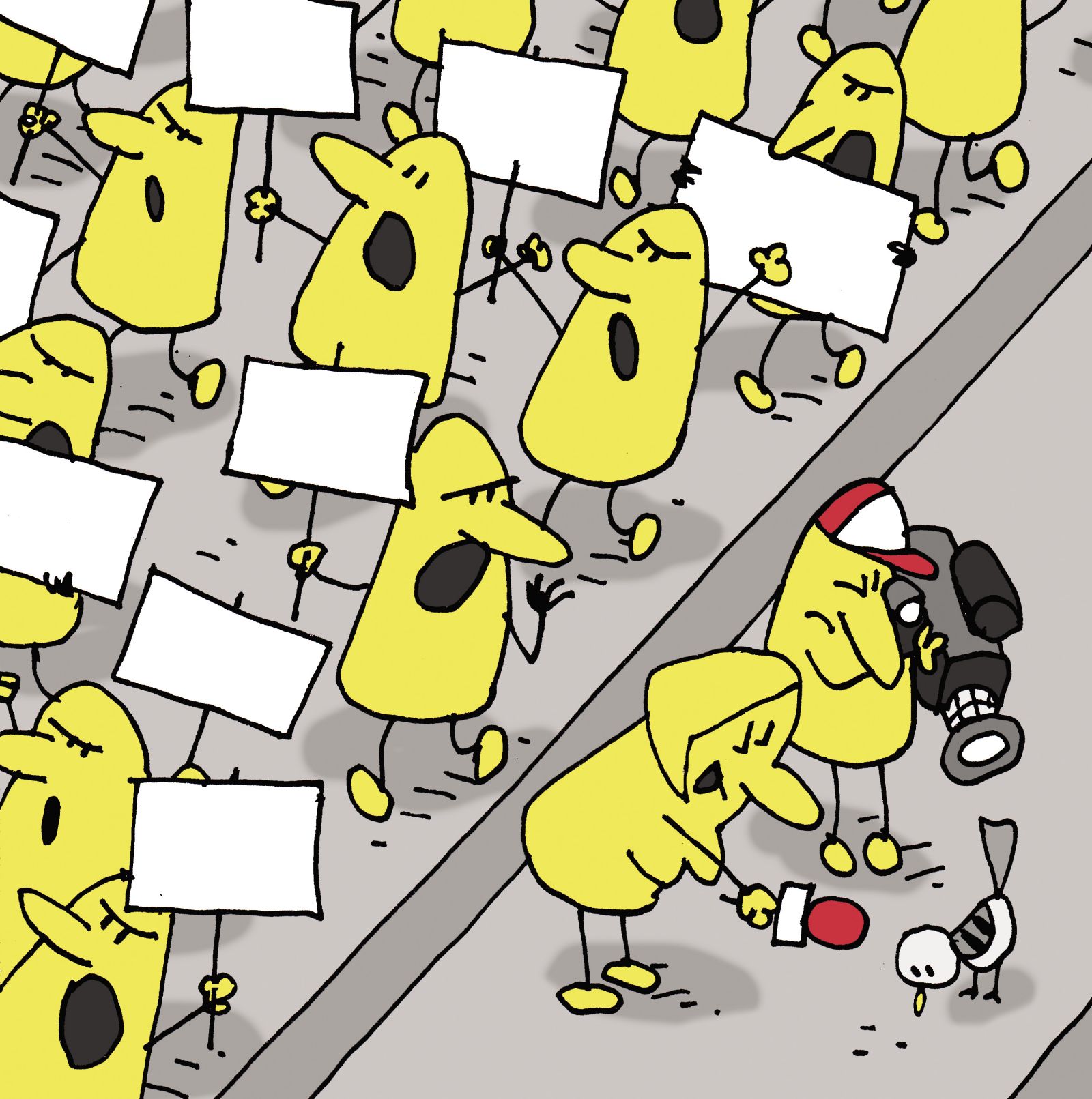 Kot da bi sledili stari šoli komunistične propagande iz poznega obdobja, ko je cenzuro dogodkov izvajala tako, da jih je bagatelizirala, ko jih je le neopazno omenjala. Ni naključje, identično ravna tudi drugi javni medij, kot je tiskovna agencija STA, ki vest o demonstracijah povzame v stavku nekje pred koncem, pod naslovom, ki govori o seji mestnega sveta.