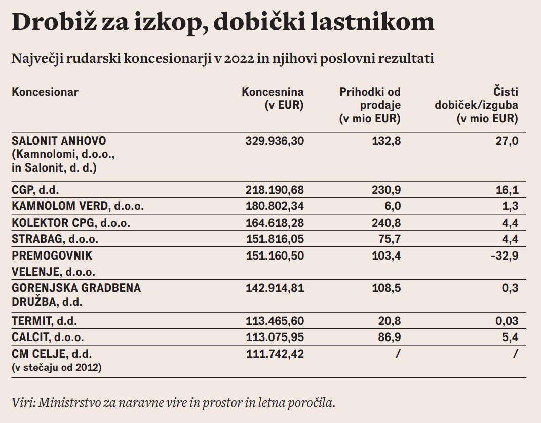A to ni vse: avstrijski Wietersdorfer je ob Salonitu in njegovih štirih kamnolomih še 50-odstotni solastnik podjetja Calcit iz Stahovice pri Kamniku in 100-odstotni lastnik podjetja InterCal iz Zagorja ob Savi. Ti podjetji izkopavata mineralne surovine še v šestih kamnolomih po državi. Ob tem zlasti Calcit, ki tako kot Salonit sodi med deset največjih rudarskih koncesionarjev v Sloveniji, veliko večino proizvodov izvozi v tujino; lani je le 15 odstotkov prodajnih prihodkov ustvaril v Sloveniji, skupina Salonit pa recimo malo čez polovico. Vsa tri podjetja, Salonit, Calcit in InterCal, so sicer dobičkonosna, Wietersdorfer je iz njih zgolj v zadnjih treh letih potegnil skoraj 25 milijonov evrov dividend. Država in občine, kjer tri podjetja kopljejo osnovne surovine, pa letno dobivajo manj kot pol milijona evrov kompenzacij oziroma koncesnin, lani recimo 451.302 evra. Med največjimi rudarskimi koncesionarji v Sloveniji je tudi avstrijski gradbinec Strabag, ki je za izkop dolomita v Lukovici lani državi in občini skupaj plačal 152 tisoč evrov, avstrijska matica pa si je zgolj v zadnjih treh letih, 2020-2022, izplačala 5,4 milijona evrov dividend. Tudi domačim gradbincem – rudarskim koncesionarjem gre zadnja leta izvrstno; novomeški CGP v lasti zakoncev Južna, ki sta po zadnji Managerjevi lestvici z 227 milijoni evrov šesta najbogatejša Slovenca, je lani za kamnolome v šestih občinah plačal 218.190 evrov rudarskih koncesnin, ustvaril pa rekordnih 16 milijonov evrov čistega dobička. CGP je bil lani tudi »državni rekorder« pri javnih naročilih; dobil jih je za skoraj 269 milijonov evrov. Edini koncesionar z izgubo je že omenjeni Premogovnik Velenje, ki z izkopom lignita za kurjenje, torej fosilnega goriva, posluje z izgubo že vseh zadnjih pet let.