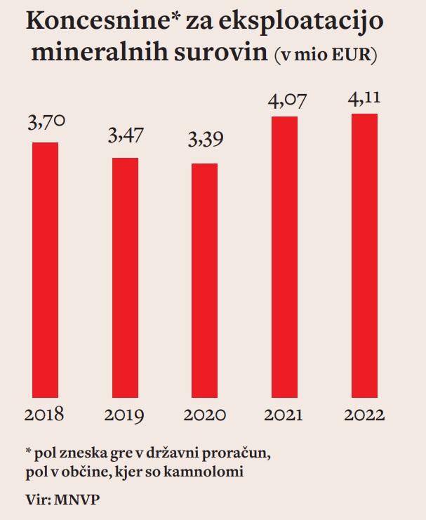 Država je lani od okrog 120 podjetij, ki se v Sloveniji ukvarjajo z izkopom ter seveda s prodajo mineralnih surovin – gre zlasti za različne vrste kamnin in peska, ki se uporabljajo v gradbeništvu – pobrala le 4,1 milijona evrov koncesnin. Gre za izjemno nizek znesek. Država je na primer lani iz državnega proračuna zgolj za nadomestne dele za vozila, ki jih uporabljajo javni uslužbenci, plačala 9,4 milijona evrov. Kako nizek je znesek koncesnin, nam še bolj nazorno pokažejo visoki dobički, ki jih koncesionarji kujejo z izkopanimi surovinami, ki so sicer omejen in neobnovljiv naravni vir. A apetiti koncesionarjev, med katerimi jih je več v tuji lasti, naj bi bili še večji: doseči želijo trajno spremembo zakona o rudarstvu, ki bi pri odločanju o izkoriščanju mineralnih surovin ošibila občine in pristojnosti v večji meri prenesla na državo. Taka ureditev je zdaj začasno že uvedena kot del načrta popoplavne obnove.