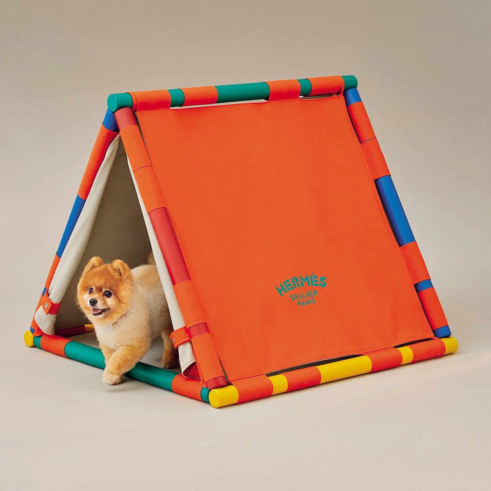 Kaj podariti psu, ki ima že vse? Francoska firma Hermès, ki ponuja luksuzne dobrine, s posebno linijo izdelkov skrbi za to, da za razkošje niso prikrajšani niti štirinožci razsipnežev. Izdelujejo vse od dežnih plaščkov za pse, ovratnic, povodcev do ležišč, odejic, pasjih posodic za hrano, tržijo celo plastičen frizbi za dvesto evrov. Letos so pasjim noblesam namenili še hišico v obliki šotora, poimenovano Cavaletti. Ta italijanska beseda sicer poleg konjičkov označuje tudi lesene ovire, ki jih konji preskakujejo na tekmovanjih in so bile navdih za barvite lesene palice, ki sestavljajo ogrodje pasjega šotorčka. Platno, ki je napeto nanje, je vodotesno ter ga je mogoče obračati, saj je na eni strani oranžno, na drugi pa belo. V opisu izdelka sicer žalijo pse, saj naj bi bil šotor za malo več kot poldrugi tisočak evrov namenjen »jahačevemu drugemu najboljšemu prijatelju«. Velja omeniti, da se je tvrdka Hermès razvila iz pariške delavnice, ki je nastala pred malo manj kot dvema stoletjema in v kateri so izdelovali visoko kakovostne jermene ter uzde za kočije evropskih aristokratov, konja s kočijo pa imajo tudi v svojem logotipu.
