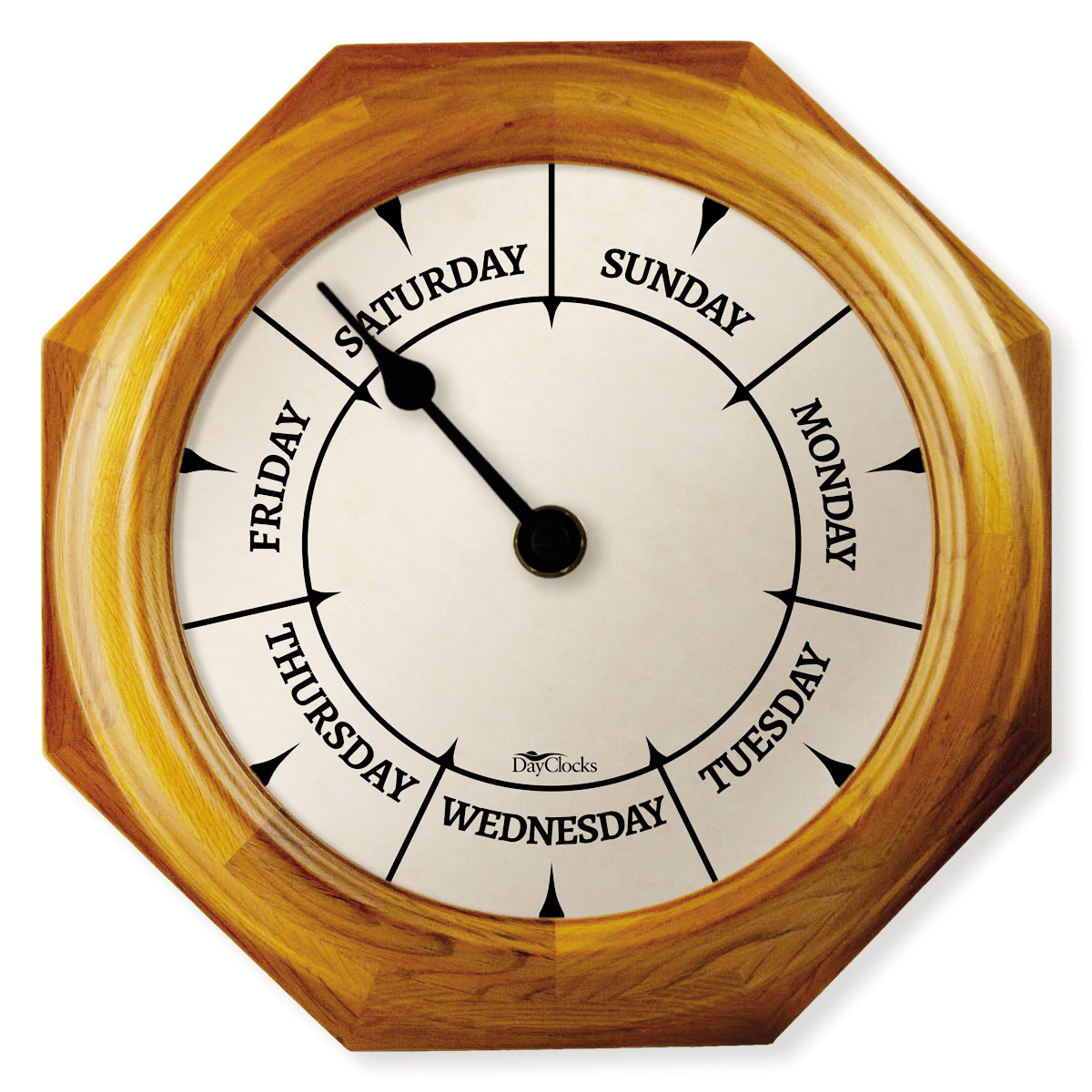 Čas je relativen. To nam sporoča tudi stenska ura, pri kateri lahko od časovnih koordinat izvemo le to, kateri dan v tednu je. Znotraj vsakega dneva je na številčnici sicer še grafična oznaka, ki loči dopoldanski del dneva od popoldanskega. Dayclock, dnevna ura, kot se časomer imenuje, je »popolna ura za vsakogar, ki ima to srečo, da meri življenje v dnevih in ne urah«. Kot darilo bo na poslovilni službeni zabavi novopečenega upokojenca verjetno bolj razveselila od sprehajalne palice s humornim dodatkom, kot sta čutara ali kolesarski zvonec. Primerna je za pustolovce, ki se na jadrnici odpravljajo na pot okoli sveta, za počitniške hišice, pa tudi bolnike z demenco ali Alzheimerjem. Številčnica z enim samim kazalcem je v okvirju iz hrastovega, mahagonijevega, borovega lesa ali pa iz aluminija.
