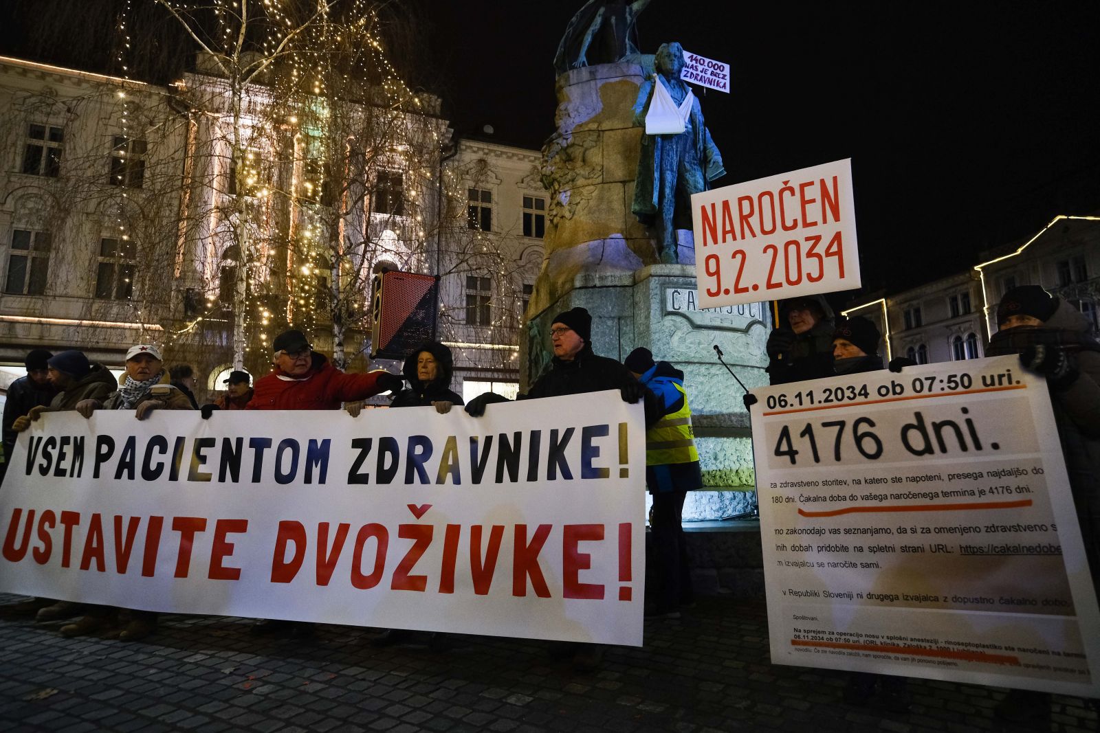 Protest se je odvil na Prešernovem trgu, ki so ga simbolično poimenovali v Trg čakajočega pacienta, Prešernov kip je za čas protesta nosil opornico na roki. Po nekaterih ocenah se je zbralo okoli 200 ljudi.