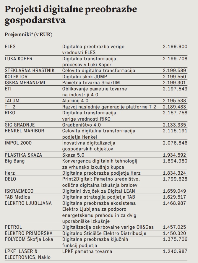 Skoraj 2,2 milijona evrov nepovratnih sredstev je za »celovito digitalno transformacijo« dobil konzorcij na čelu s Steklarno Hrastnik v lasti Igorja Laha, ki je po lestvici revije Finance Manager najbogatejši Slovenec s 385 milijoni evrov premoženja. »Premoženje družine Lah se je v štirih letih početverilo, za kar gre zasluga predvsem veliki rasti vrednosti Steklarne Hrastnik,« so decembra zapisali v Managerju. Kljub temu se podjetje v lasti milijonarja digitalizira z javnim denarjem, ravno decembra pa je poslalo na čakanje približno 200 zaposlenih v proizvodnji in režiji (predvidoma do konca marca). Skoraj dva milijona evrov je na razpisu dobil konzorcij trgovca Big Bang; z nepovratnim javnim denarjem bo financiran projekt »Orchestrate.Digitalize.Transforms«, s katerim bo Big Bang v lasti podjetja Adventura Investments (njegov največji lastnik je Darko Klarič, leta 2022 je imelo 2,3 milijona evrov čistega dobička) kupcem zagotovil »naslednjo stopnjo vrhunske izkušnje«, ki bo enotna kljub menjavi virtualnih in fizičnih kanalov.
