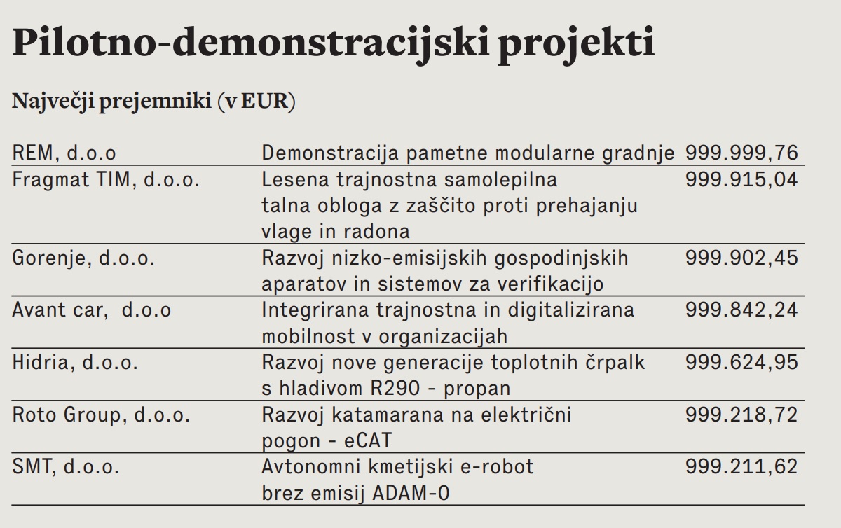 Za konec ošvrknimo še en razpis, lanski drugi najobsežnejši, na katerem je bilo razdeljenih 20,5 milijona evrov za »pilotno-demonstracijske projekte«. To je nepovratni denar za sofinanciranje prebojnih zamisli, »usmerjenih v zeleni prehod in krožno gospodarstvo za krepitev odpornosti«. Med 49 ustreznimi vlogami jih je bilo izbranih le 21, razen enega projekta so vsi izbrani dobili skoraj milijon evrov. Med izbranimi je recimo biotehnološko podjetje GenePlanet Marka Bitenca (soimenjak ima Kirurgijo Bitenc), zoper katerega je skupaj z bivšim gospodarskim ministrom Zdravkom Počivalškom sprožena preiskava zaradi dobav ventilatorjev v času epidemije covida. GenePlanet, širše znan zlasti po oglaševanju testov DNK (za 449 evrov lahko med pravkar potekajočo promocijsko akcijo »odklenete svoj genom«), je 978.392 evrov javnega denarja dobilo za projekt, s katerim naj bi razvilo energetsko učinkovitejše obdelovanje genomskih podatkov na grafičnih procesorjih.