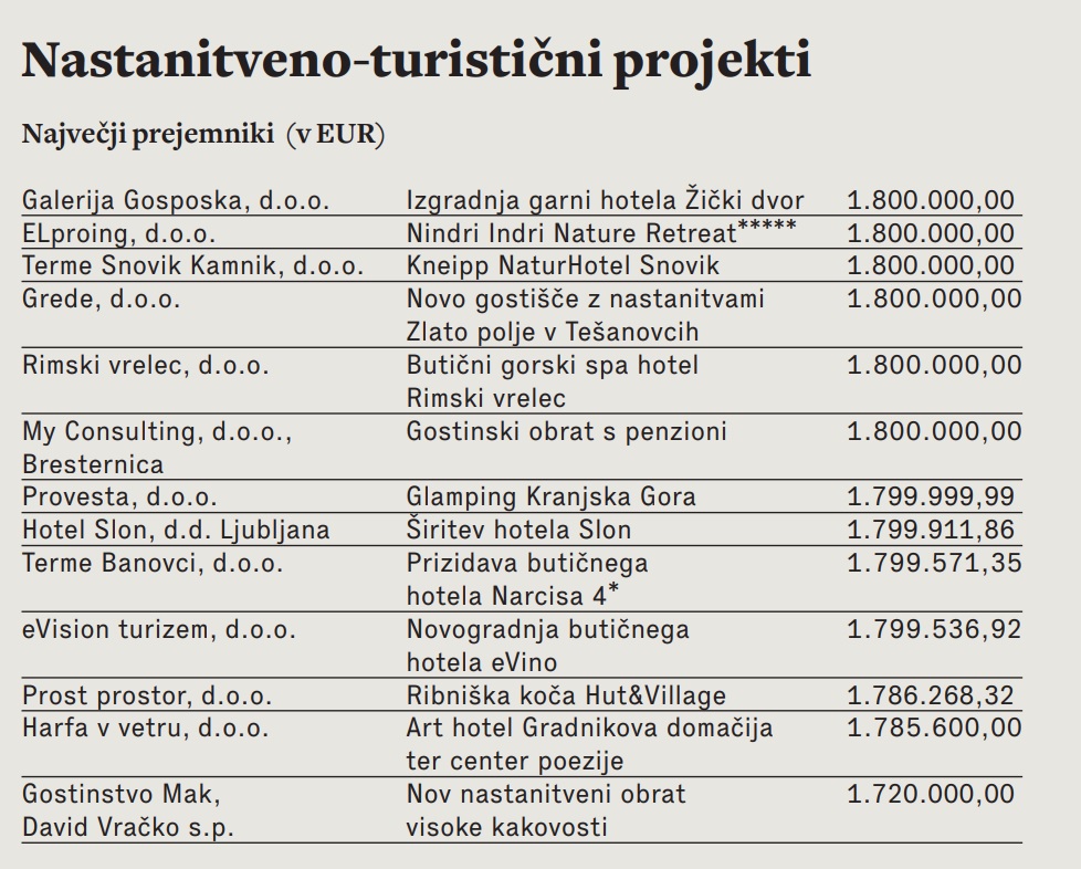 Poglejmo še drug razpis gospodarskega ministrstva, na katerem je bilo lani razpisanega največ denarja iz mehanizma za okrevanje in odpornost, 58 milijonov evrov za sofinanciranje vlaganj v »nastanitveno turistično ponudbo za dvig dodane vrednosti turizma«. Od 60 izbranih projektov jih je 25 dobilo več kot milijon evrov, pri nekaterih projektih odobreni razpisni denar krije celo več kot polovico načrtovane naložbe, kar bi pričakovali pri družbeno res pomembnih projektih. Je tak recimo projekt »rekonstrukcija vinskega penziona Tempelj Probus«, za katero je razpisna komisija podjetju Misego iz Jakobskega Dola odobrila slab milijon ali kar 51-odstotno kritje z javnim denarjem? Nepovratni milijoni bodo porabljeni za (nove) hotele, gostilne in glampinge, ki morajo biti končani do 30. junija 2026. Mar ne bi bilo smiselneje vlagati v javno infrastrukturo, na primer v plažo v Žusterni, smo v intervjuju vprašali ministra Hana. Odgovoril je: »… to tudi mene muči pri vseh teh milijonih.«