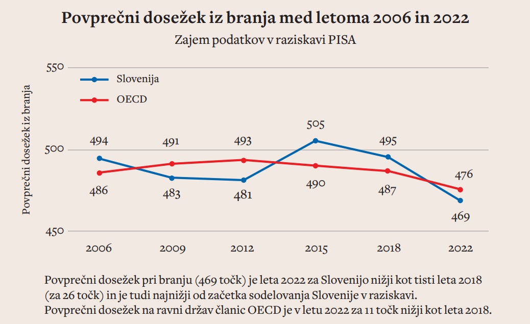 Da mladi ne znajo več brati, pisati, se osredotočiti in reševati težjih (ali celo lažjih) besedilnih nalog, je danes slišati od vsepovsod. Zadnji rezultati raziskave bralne pismenosti slovenskih četrtošolcev (PIRLS 2021) so strmoglavili pod raven iz leta 2006. Katastrofalni, je slišati med pedagogi, so tudi rezultati zadnje mednarodne raziskave PISA 2022, ki meri bralno, matematično in naravoslovno pismenost 15-letnikov. Slovenija se je na vseh treh področjih odrezala najslabše doslej. Čeprav se lahko pohvali, da se ji je – kljub poslabšanju – pri rezultatih matematične in naravoslovne pismenosti uspelo ohraniti nad povprečjem držav OECD, je pod to (spet) zdrsnila pri bralni pismenosti. Vse več 15-letnikov menda ne dosega niti temeljne ravni bralne pismenosti. Leta 2018 jih je to raven doseglo 82 odstotkov, po zadnji raziskavi se je ta delež zmanjšal na 74 odstotkov, najvišjo raven bralnega znanja in spretnosti pa dosegajo štirje odstotki slovenskih dijakov (ta delež je v državah OECD sedem odstotkov).