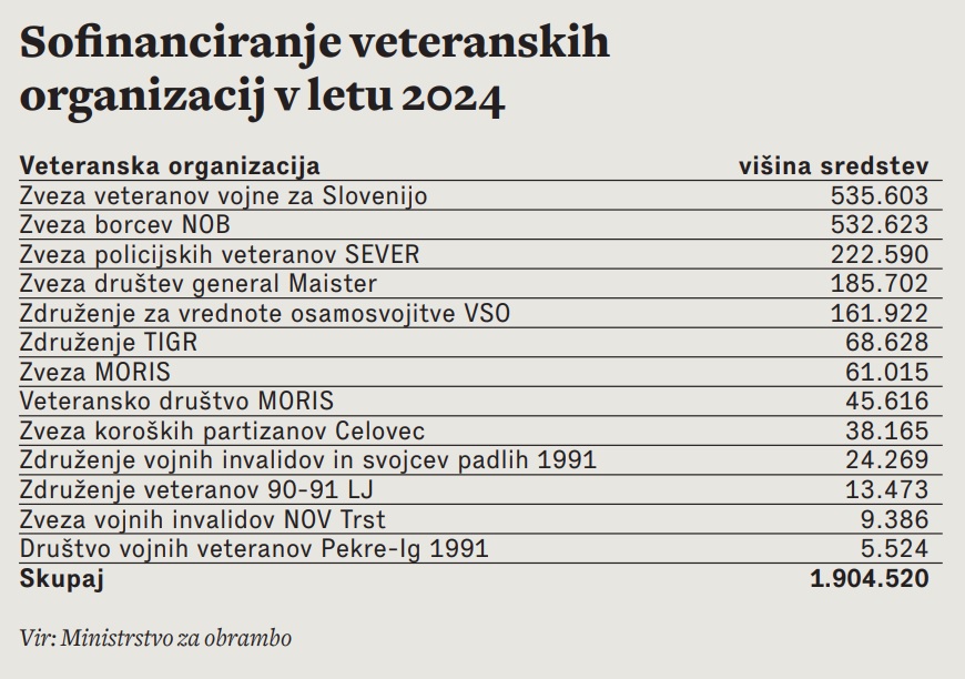 Veteranskih organizacij, ki se potegujejo za nepovratna javna sredstva za delovanje, je danes skupaj 13. Izstopata dve – Zveza veteranov vojne za Slovenijo in Zveza združenj borcev NOB – ki sta največji in deležni tudi najvišjega financiranja z dobrega pol milijona evrov na leto vsaka. Sledijo Zveza policijskih veteranskih društev Sever (222 tisoč evrov), Zveza društev general Maister (185 tisoč evrov) ter Združenje za vrednote slovenske osamosvojitve (162 tisoč evrov). Naslednja trojka društev je deležna že precej skromnejšega financiranja, to so Združenje TIGR (69 tisoč evrov), Zveza MORIS (61 tisoč evrov) ter še dodatno Veteransko društvo MORIS (45 tisoč evrov). Preostalih pet veteranskih društev prejme od 38 tisoč do 5000 evrov. Podatki so za letošnje leto, ko je država v ta namen skupaj namenila 1,9 milijona evrov.