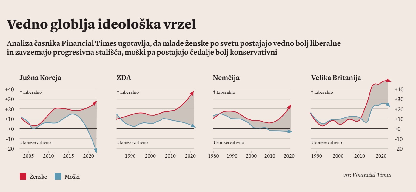 A ta pojav ni omejen samo na Slovenijo, mogoče ga je opaziti tudi drugod po svetu. Raziskave namreč ugotavljajo, da naj bi med mladimi ženskami in moškimi, starimi med 18 in 30 let, gre za tako imenovano generacijo Z, nastajala vedno globlja ideološka vrzel. Ženske naj bi postajale vedno bolj liberalne in naj bi zavzemale progresivna stališča, ko gre za pomembna družbena vprašanja, moški pa naj bi postajali vse bolj konservativni. Pri britanskem poslovnem časniku Financial Times, kjer so na ta pojav opozorili ob začetku leta, so zato zapisali, da na generacijo Z ne bi smeli več gledati kot na eno, homogeno generacijo – pač pa kot na dve različni.