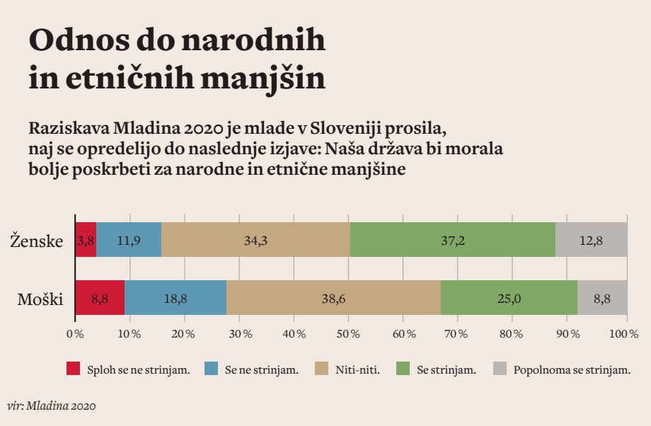 Trendi naraščajočega ideološkega prepada med spoloma so sicer izrazitejši v gospodarsko razvitih državah, kjer so tudi razlike med spoloma najbolj opazne. »Slovenija med takšne države ne spada,« pojasni sociolog dr. Miran Lavrič, vodja zadnjih dveh longitudinalnih raziskav o položaju mladih pri nas, Mladine 2010 in Mladine 2020. »V mednarodni primerjavi po zadnjih podatkih globalnega indeksa neenakosti med spoloma (Global Gender Gap Index) za zdaj nismo v kritičnem položaju,« doda. Četudi tako velikih premikov kot ponekod v Sloveniji morda ni zaznati, pa to še ne pomeni, da razlike med spoloma ne obstajajo.