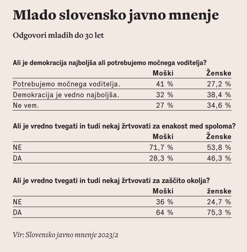 Rezultati zadnje raziskave Slovensko javno mnenje pokažejo, da so razhajanja po spolu med mladimi, ko gre za nekatera pomembna družbena vprašanja, precej očitnejša kot pri starejših od 30 let, kjer so ta večinoma zanemarljiva, zato bomo te vrednosti v nadaljevanju navajali kot skupna povprečja obeh spolov. Bolj kot demokraciji je močnim voditeljem naklonjenih 41 odstotkov mladih moških in 27 odstotkov mladih žensk. Ta delež med starejšimi od 30 let znaša 37 odstotkov. Da je za enakost med spoloma vredno kaj tvegati in žrtvovati, meni 28 odstotkov mladih moških in 46 odstotkov mladih žensk, s to trditvijo pa se strinja 34 odstotkov starejših. Na podobno vprašanje glede zaščite okolja je pritrdilno odgovorilo 64 odstotkov mladih moških in 75 odstotkov mladih žensk, delež med starejšimi je znašal 67 odstotkov.